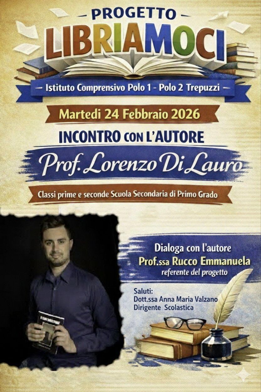 L’autore manduriano Lorenzo Di Lauro è l’ospite della rassegna letteraria “Libriamoci” a Trepuzzi, che si svolgerà martedì 24 febbraio nei due poli dell’istituto comprensivo statale del paese. Lo scrittore dialogherà con la referente del progetto, la professoressa Emmanuela Rucco, e con le classi prime e seconde della scuola secondaria di I grado. Saranno proprio gli alunni a leggere alcuni passi dei romanzi dell’autore, del suo spettacolo teatrale I fantasmi di Floyd e a porre alcune domande sul suo percorso nel mondo della scrittura.