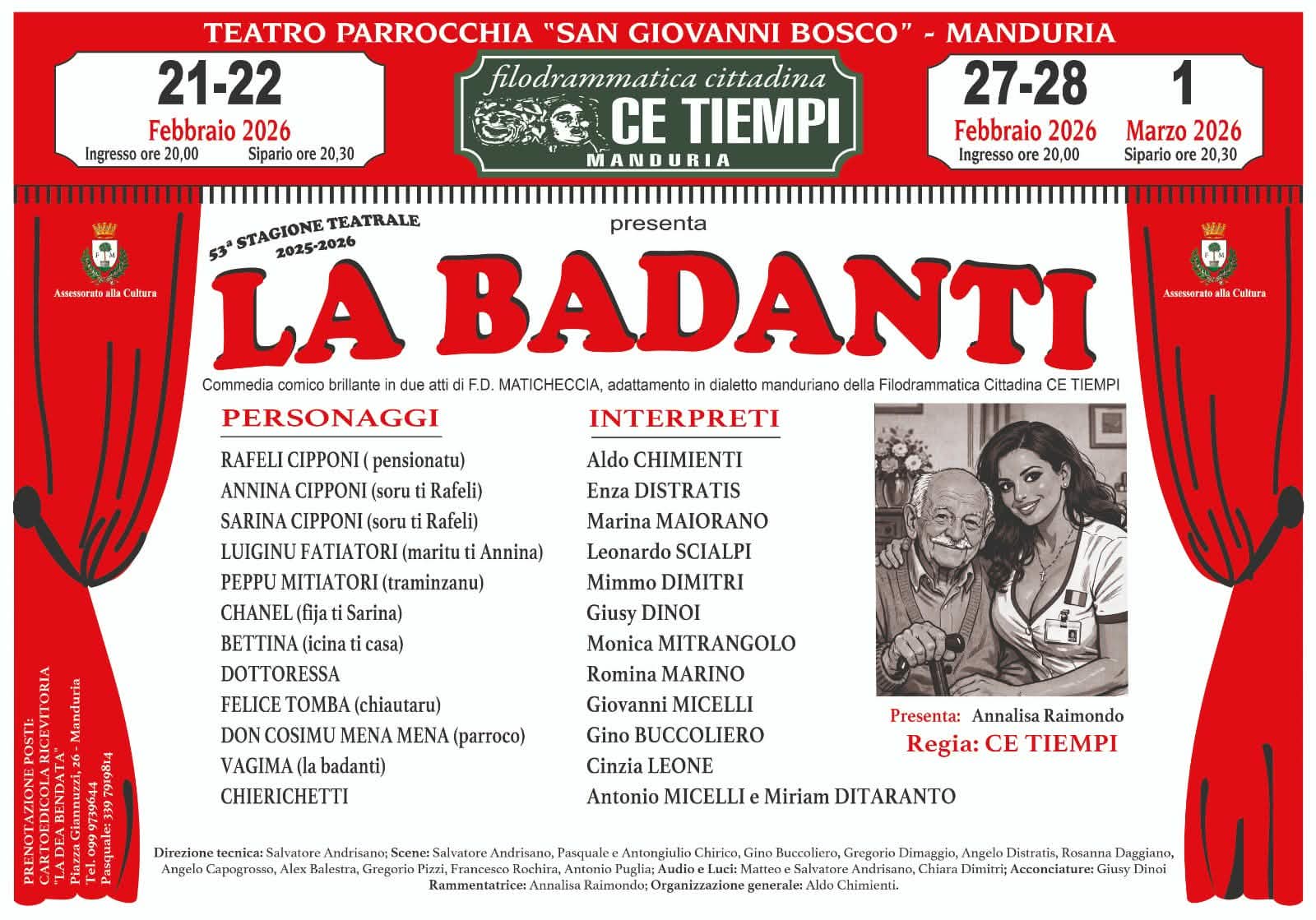 A partire da domani (sabato 21 febbraio) e nei giorni 22, 27, 28 e 1 marzo, la filodrammatica cittadina Ce Tiempi presenta, per la sua 53esima stagione teatrale, il suo ultimo lavoro dal titolo “La badanti”.