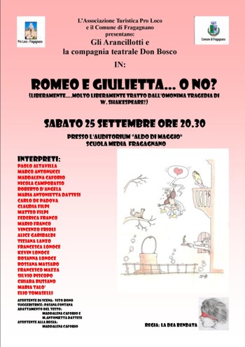 che, tratta “molto liberamente” dall’omonima tragedia di Shakespeare chiuderà, sabato prossimo, il programma del Settembre Fragagnanese, una rassegna di appuntamenti musicali, danzanti e teatrali.Protagonisti della rappresentazione di una parodia della nota tragedia sono i membri della compagnia teatrale “Gli Arancillotti” di Fragagnano, coadiuvati dalla neonata compagnia teatrale “Don Bosco” di San Marzano, i quali hanno voluto dare al loro lavoro una veste ludica, ironica, pungente, ma anche riflessiva: nella vita, così come in una commedia, ove ognuno tende a realizzare i propri sogni, è possibile che vi siano “incursioni” del destino che ci proiettano in una favola che non è la nostra. Si vive così in una “commedia degli errori”.
