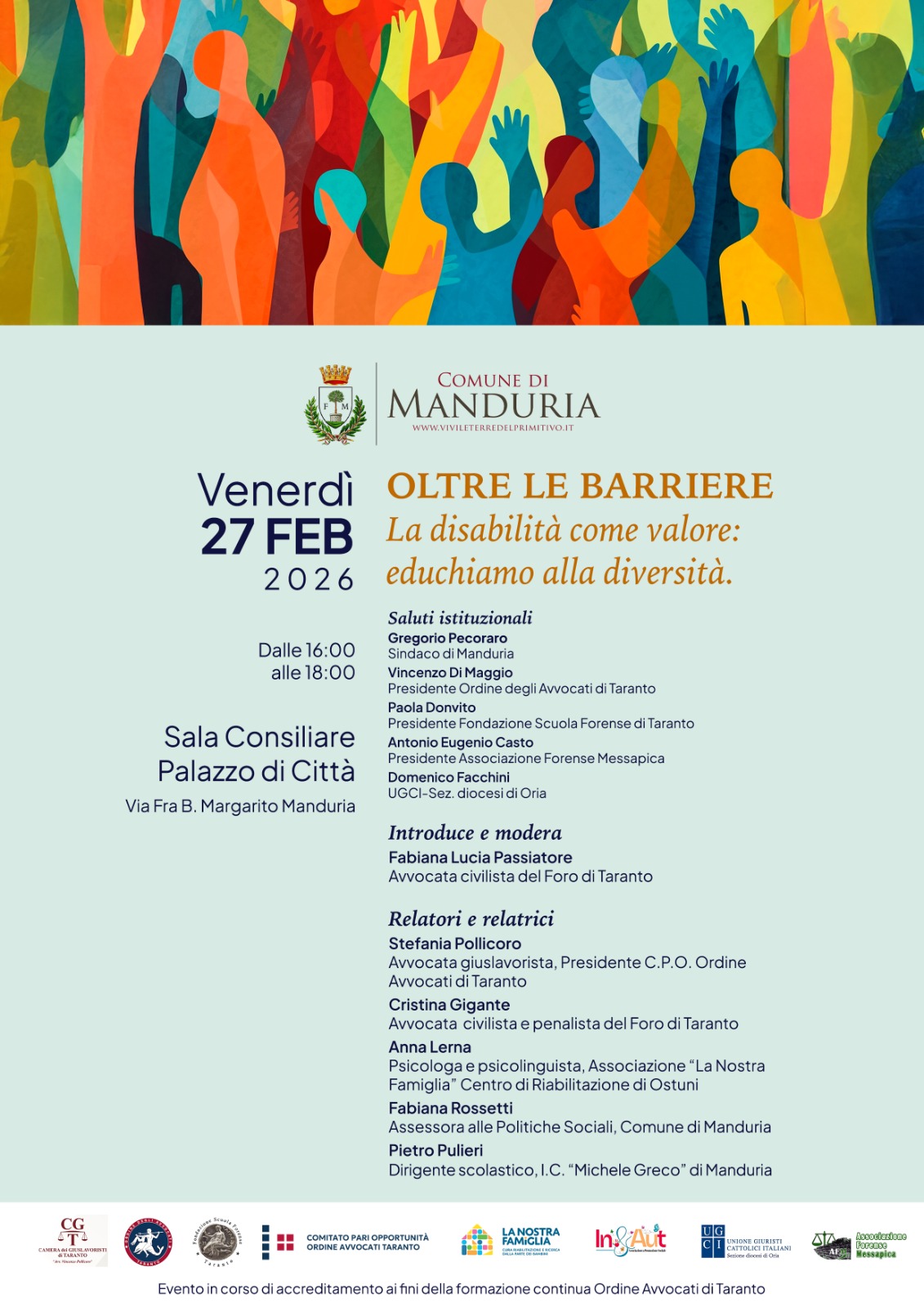 Domani (venerdì 27 febbraio), alle ore 16, presso la sala consiliare di palazzo di Città, si svolgerà il convegno sul tema “Oltre le barriere – la disabilità come valore: educhiamo alla diversità”.
