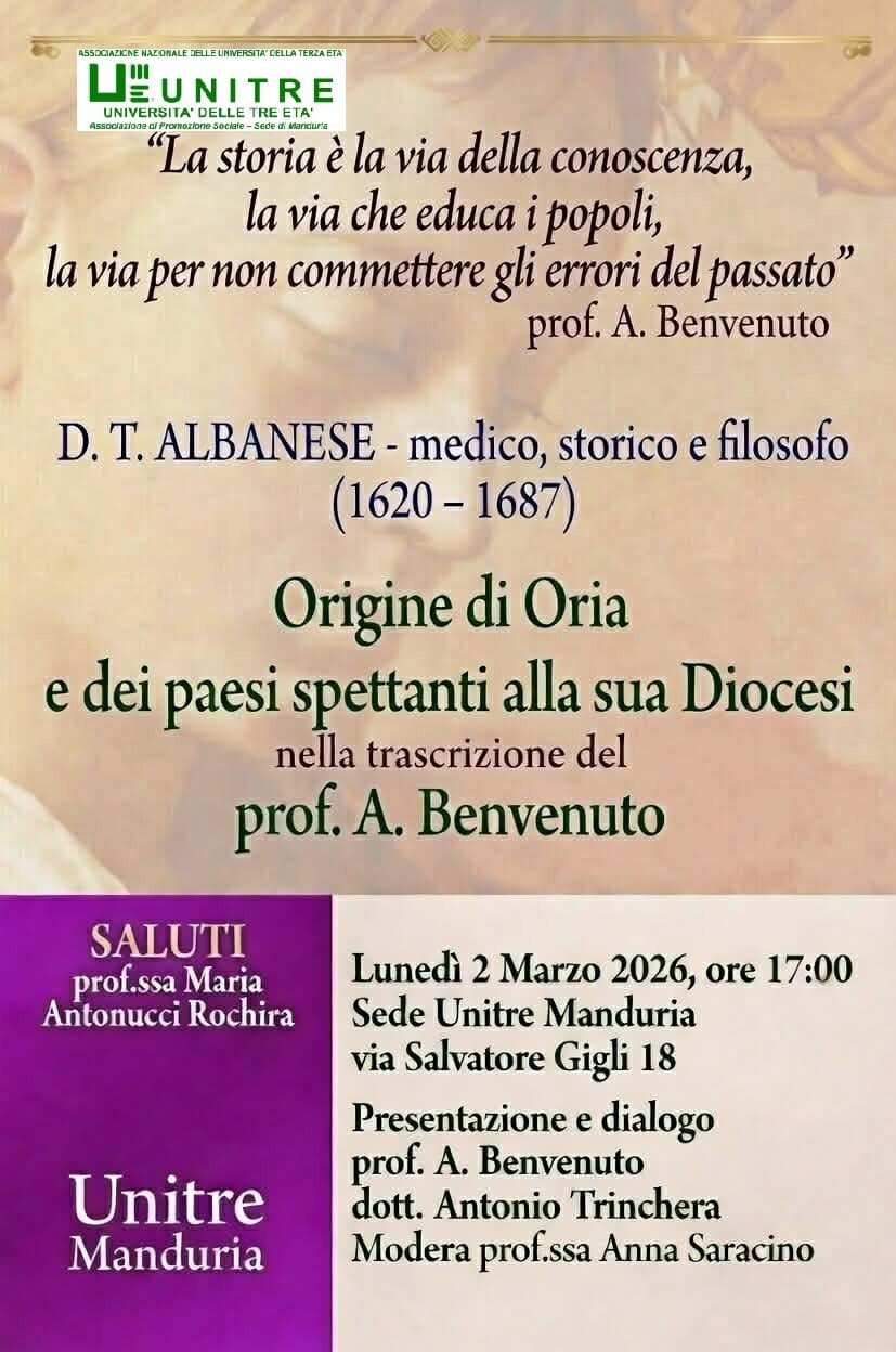Lunedì 2 marzo, presso la sede Unitre di Manduria, Antonio Benvenuto, già professore di Storia dell’Arte, socio ordinario della Società di Storia Patria per la Puglia, Antonio Trinchera, già direttore medico dell’ospedale Perrino di Brindisi, socio ordinario di Storia Patria per la Puglia, presenteranno il libro “Historia dell’antichità di Oria” e di molti luoghi spettanti alla sua Diocesi.