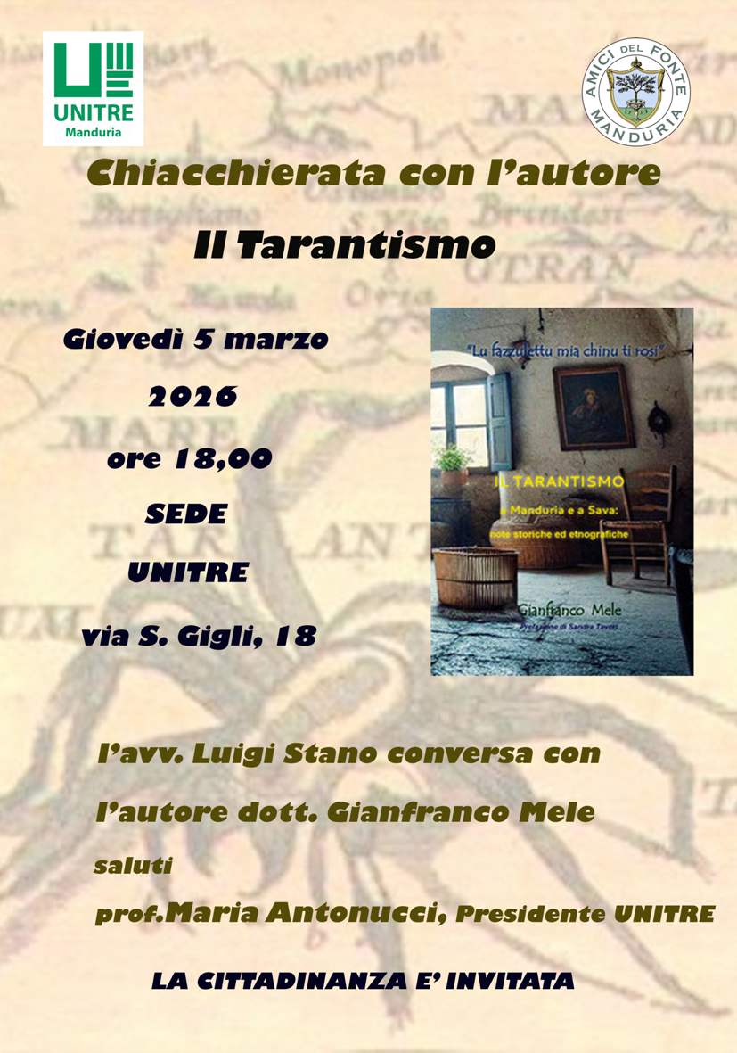 Per Chiacchierata con l’Autore giovedì 5 marzo, alle ore 18, nella sede UNITRE, via Salvatore Gigli n.18, Luigi Stano converserà con Gianfranco Mele, sociologo, studioso di tradizioni popolari, etnografie, autore di «Lu fazzulettu mia chinu ti rosi». Il tarantismo a Manduria e a Sava. Note storiche ed etnografiche.