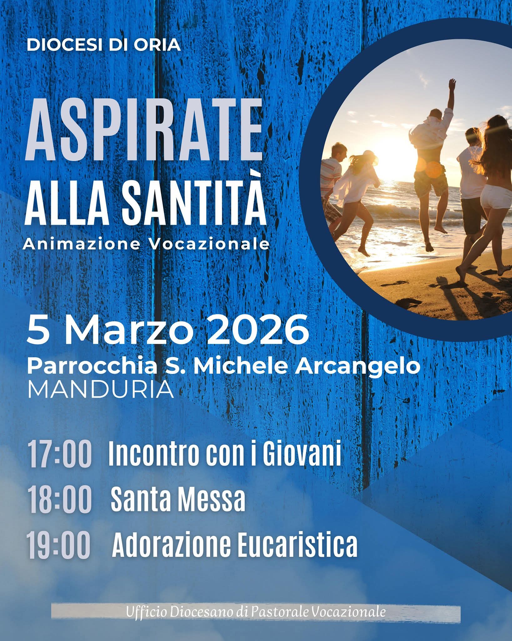 Prosegue il percorso di Animazione Vocazionale “Aspirate alla santità”, promosso dalla Diocesi di Oria e curato dall’Ufficio diocesano di Pastorale Vocazionale. Dopo i primi due appuntamenti, il cammino giunge ora al terzo incontro, in programma oggi, giovedì 5 marzo, presso la parrocchia di San Michele Arcangelo in Manduria.