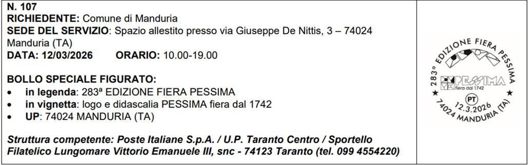 In occasione della Fiera Pessima di Manduria edizione 2026, Poste Italiane propone un evento filatelico dedicato alla manifestazione, durante il quale sarà disponibile uno speciale annullo filatelico commemorativo.