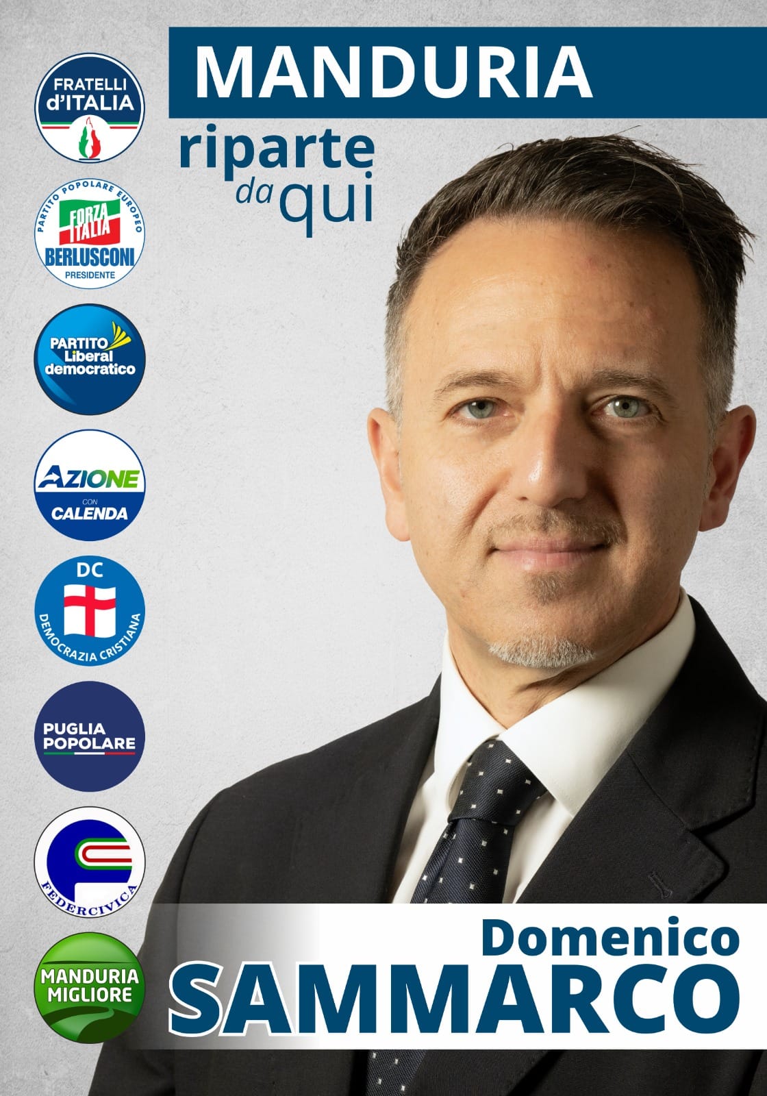 «I partiti Fratelli D’Italia, Forza Italia, Partito Liberaldemocratico, Azione, Democrazia Cristiana, Puglia Popolare e i movimenti civici Manduria Migliore e Federcivica all’esito di un percorso di condivisione annunciano oggi la candidatura a sindaco di Manduria di Domenico Sammarco, consigliere comunale di espressione civica e da tempo impegnato in numerose battaglie a tutela del territorio.