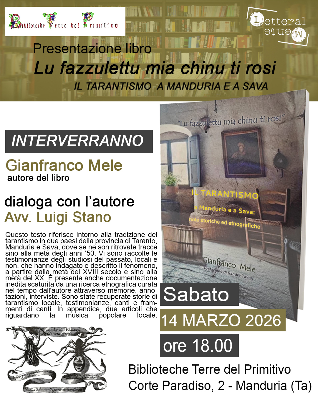 Saranno presenti l’autore del libro Gianfranco Mele e Luigi Stano, che dialogherà con l’autore sul tema del tarantismo.