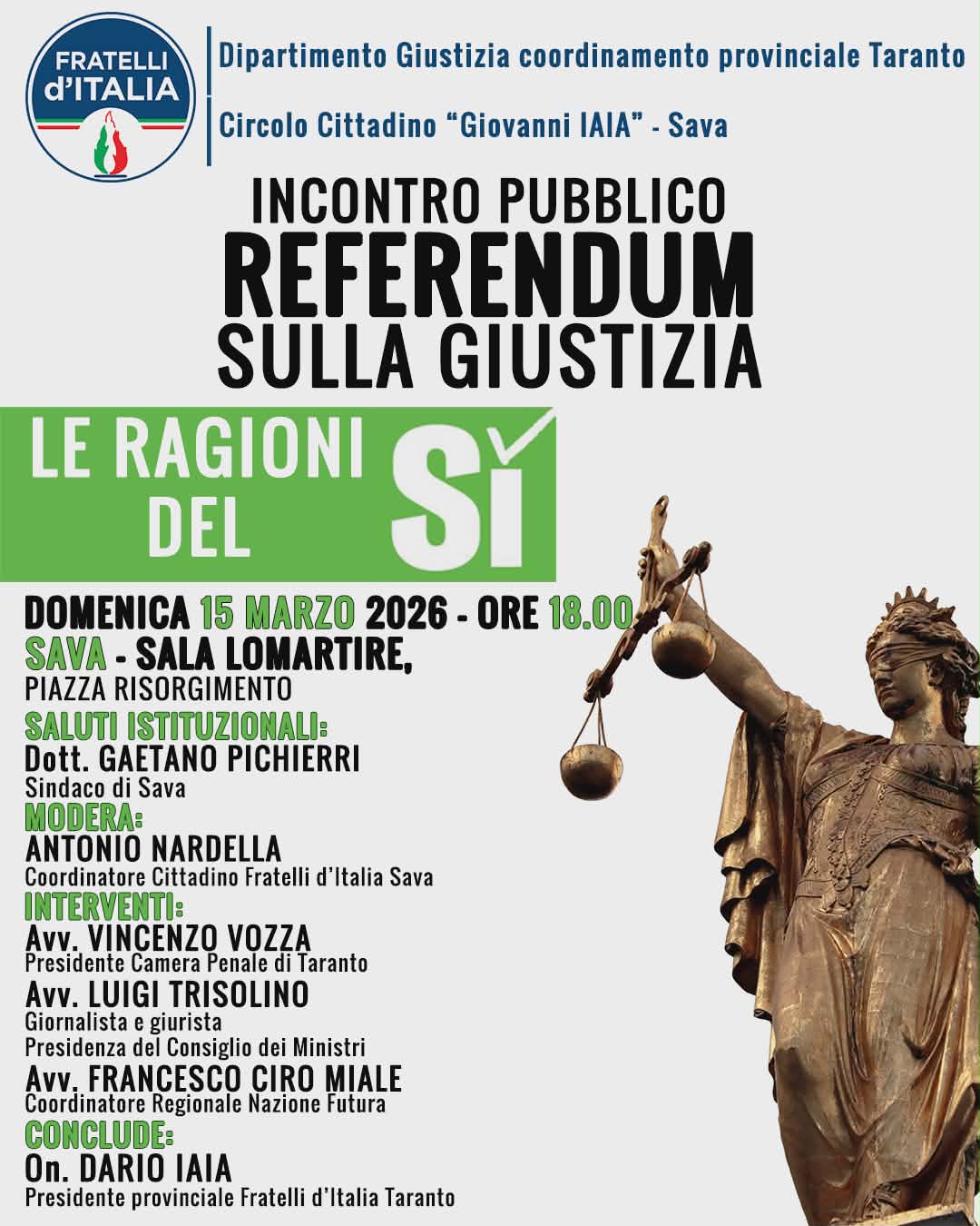 Il Dipartimento Giustizia coordinamento provinciale Taranto, insieme al circolo cittadino “Giovanni Iaia” di Sava, annunciano un incontro pubblico dedicato al referendum sulla Giustizia.