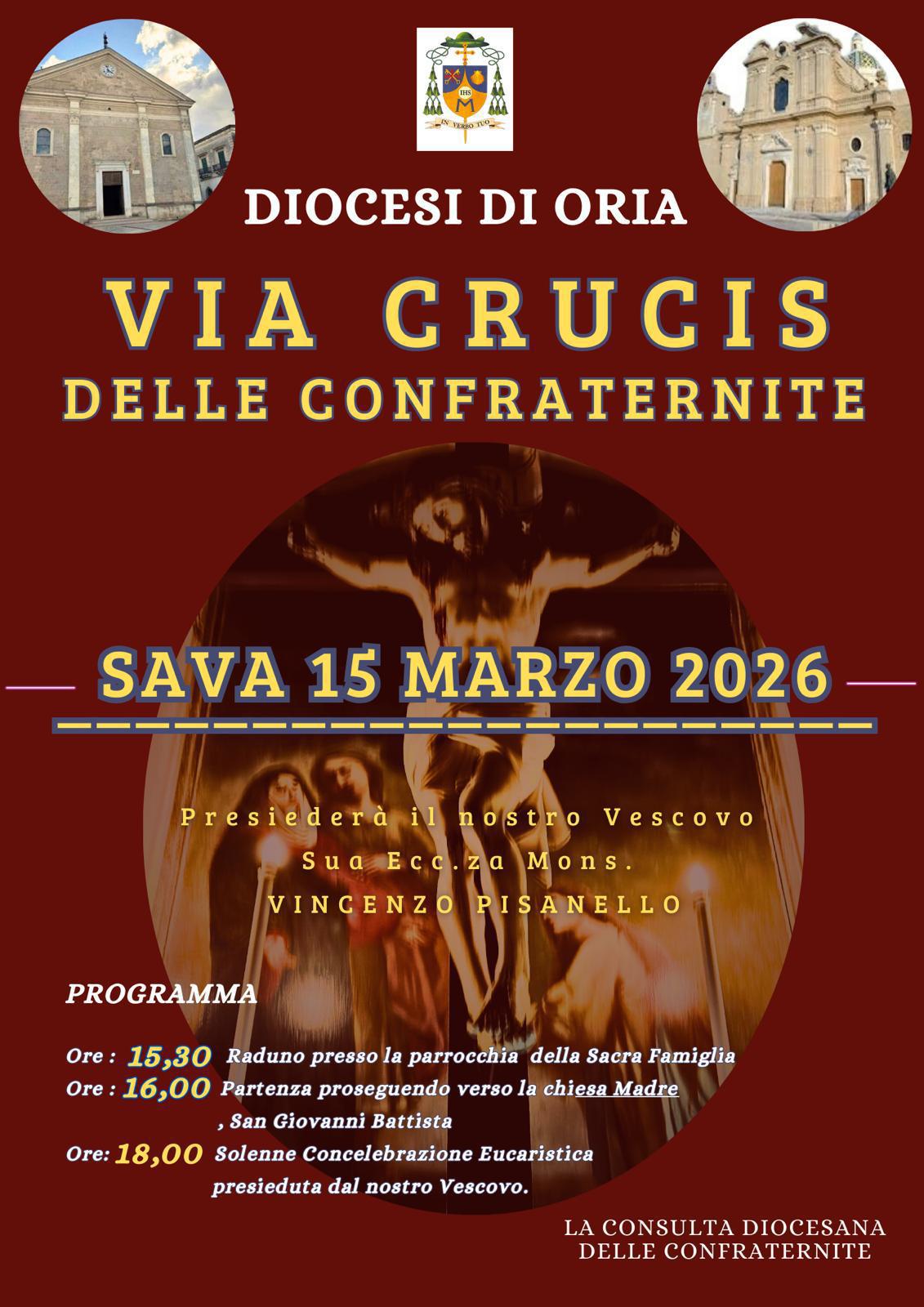 Domenica 15 marzo Sava ospiterà la Via Crucis delle Confraternite della Diocesi di Oria, promossa dalla Consulta diocesana delle Confraternite e dal competente Ufficio diocesano.