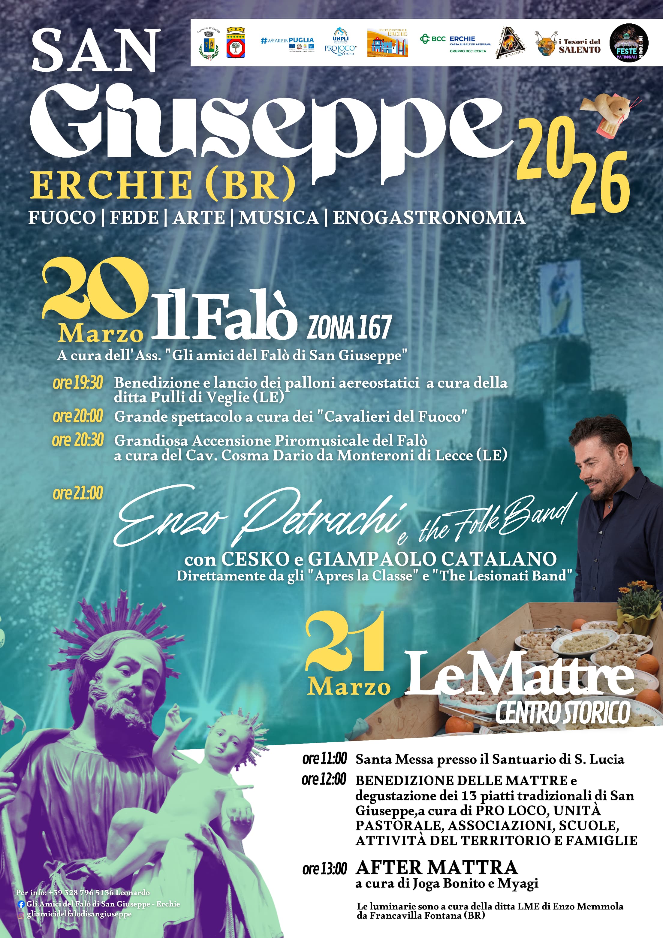 Venerdì 20 marzo vi sarà il falò, il lancio dei palloni aerostatici, lo spettacolo a cura dei Cavalieri del Fuoco e lo spettacolo di Enzo Petrachi; sabato 21 sarà la volta delle mattre e della degustazione dei 13 piatti tradizionali