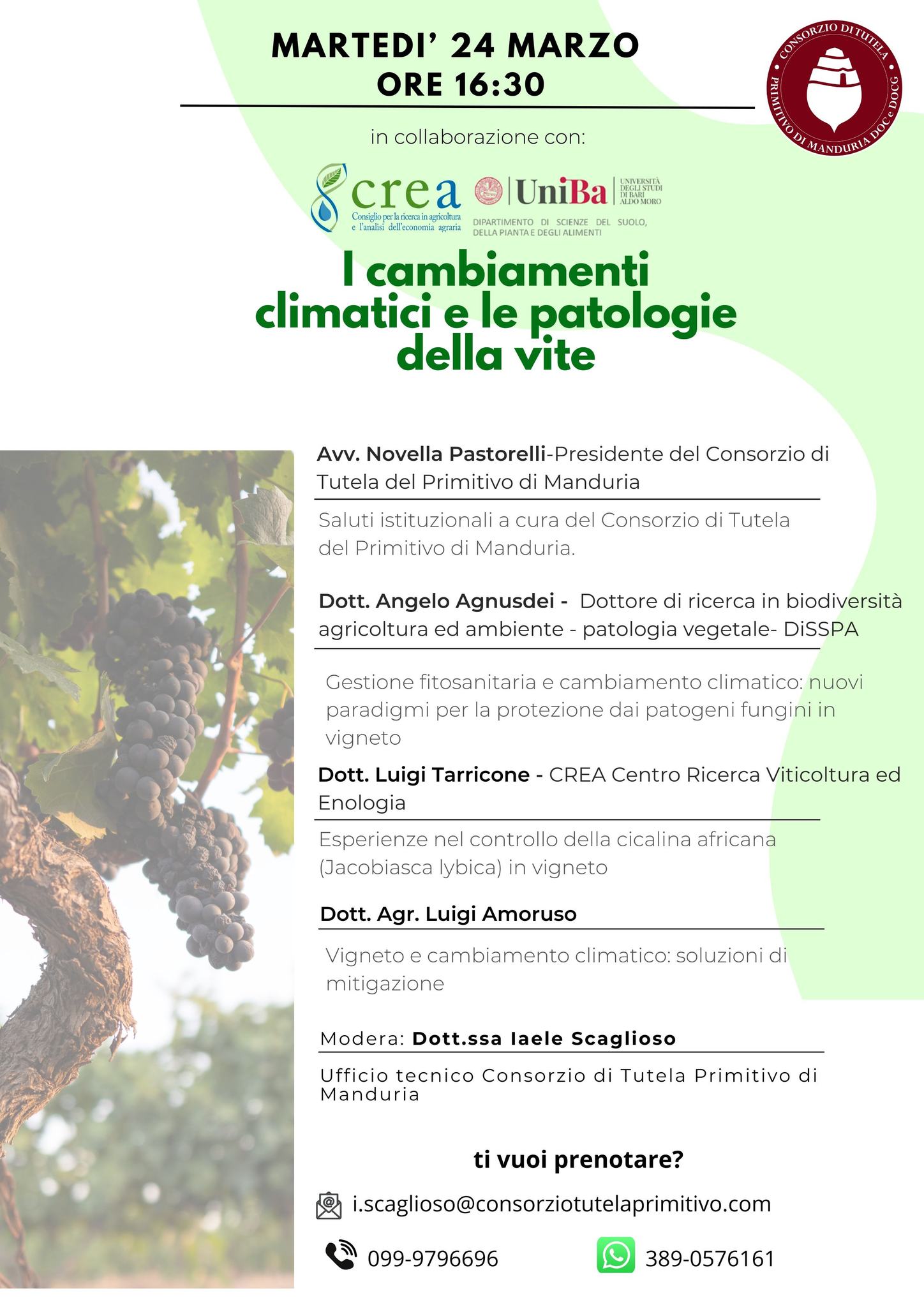 Il Consorzio di Tutela del Primitivo di Manduria organizza per martedì 24 marzo alle ore 16:30 un importante incontro dedicato a un tema sempre più centrale per il settore vitivinicolo: i cambiamenti climatici e le patologie della vite.