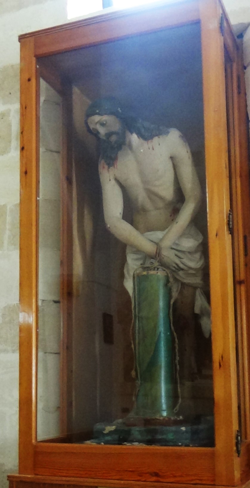 Avanzando lungo la navata, troviamo una nicchia costruita per iniziativa di alcuni fedeli, in cui è collocata una scultura di Cristo legato alla colonna. La statua, di autore ignoto, è datata dal Polito[6] alla seconda metà del XIX secolo, è in cartapesta dipinta e narra l’episodio di Gesù flagellato e legato a una colonna. Probabilmente il simulacro veniva utilizzato in passato durante i riti della Settimana Santa. Il corpo del Cristo, emaciato e sofferente, è ricoperto da un perizoma bianco annodato ai fianchi. La scultura è stata oggetto di restauro, nel 1960 e nel 1980, ad opera del manduriano Ettore Marzo.