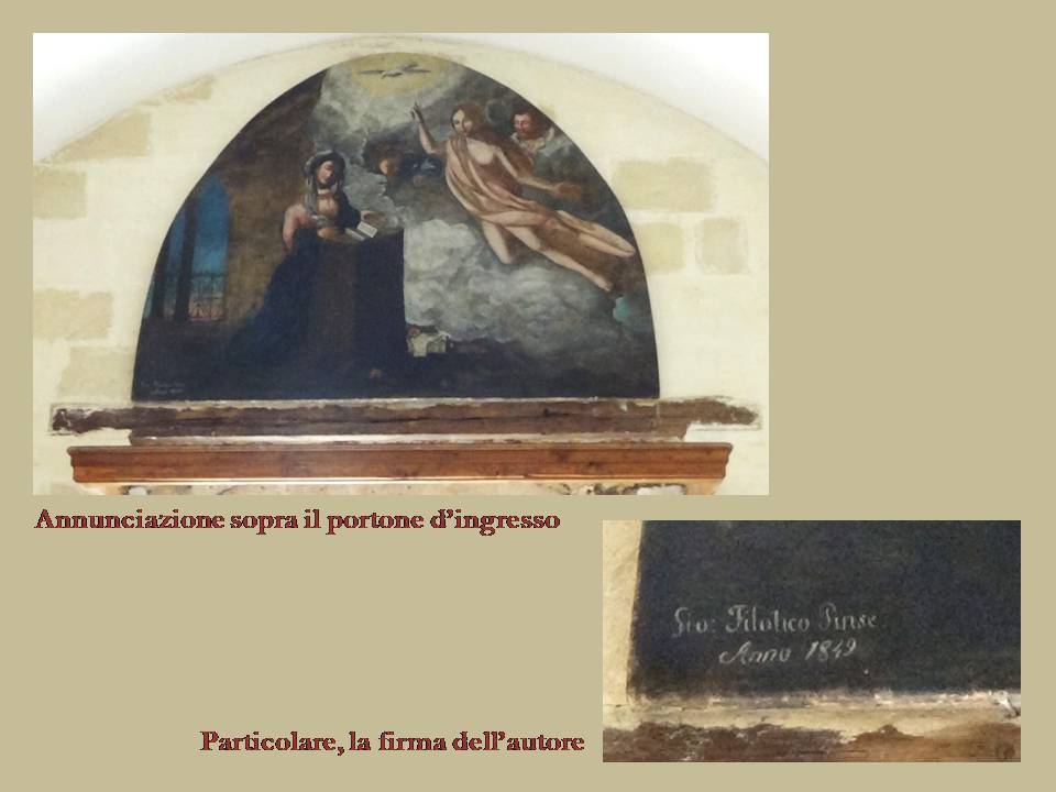 Al tempo del Tarentini, sull’altare principale era collocata una tela raffigurante l’Annunciazione, che attualmente si trova sopra il portone d’ingresso. Si tratta dell’ “Annunciazione di M. Vergine” dipinta da Giovanni Filotico. È un olio su tela di grandi dimensioni (147x200) e in basso a sinistra reca l’iscrizione ‘Gio: Filotico Pinse / Anno 1842’.