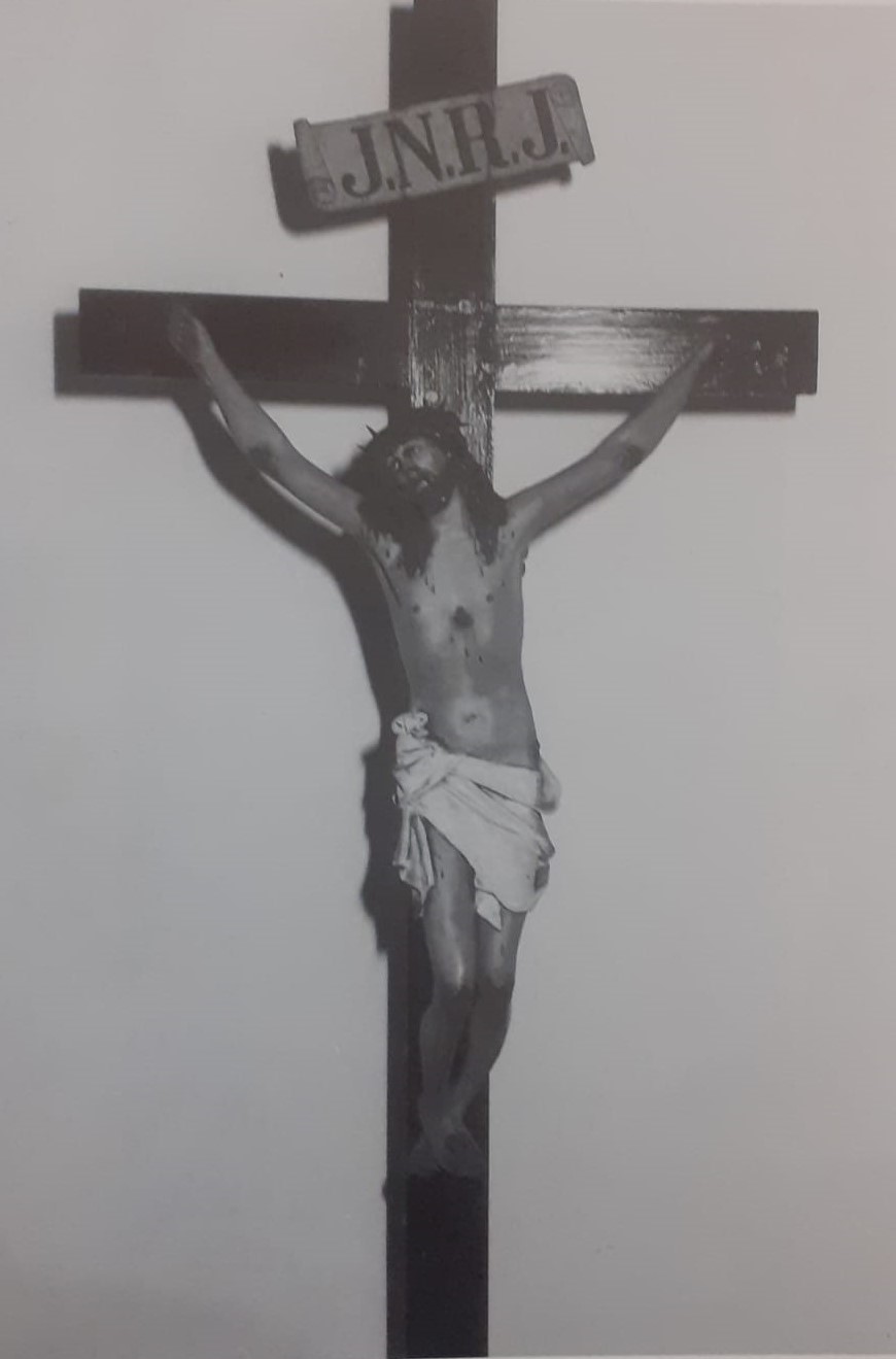 Sull’altare di sinistra, all’epoca del Tarentini, era collocato un Crocifisso raffigurante in maniera discretamente plastica il Cristo morente in croce secondo l’iconografia tradizionale, con una corona di spine in testa e con lo sguardo sofferente rivolto al cielo. Realizzato in cartapesta dipinta, un cartiglio con la scritta J.N.R.J. sul braccio verticale della croce,[7] il Crocifisso è attualmente collocato sull’altare maggiore della Chiesa Madonna del Rosario, dopo essere stato opportunamente restaurato. Al suo posto, nella Cappella, troviamo un Crocifisso in legno di diversa fattura.