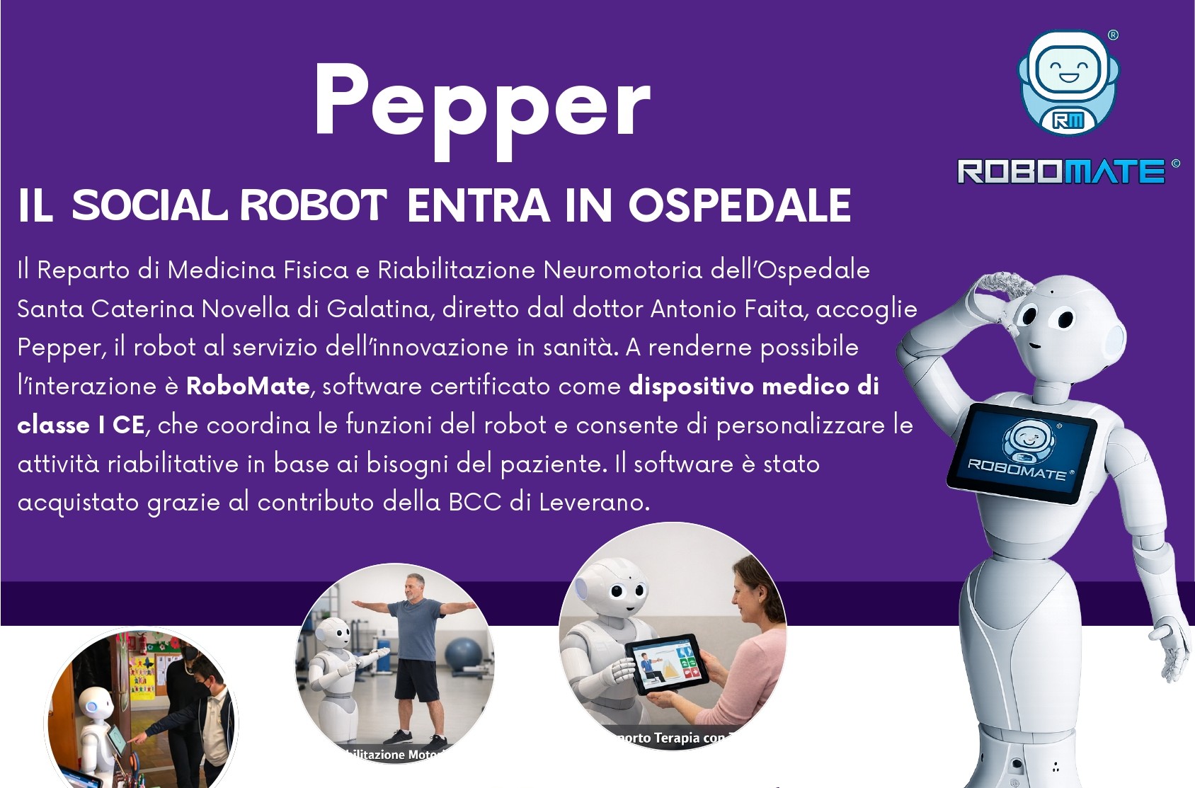 Nel reparto di Medicina Fisica e Riabilitazione Neuromotoria dell’ospedale “Santa Caterina Novella” di Galatina, diretto dal dottor Antonio Faita, sarà introdotta una tecnologia innovativa destinata a supportare concretamente il lavoro dei professionisti sanitari. Grazie alla collaborazione con l’Augmented and Virtual Reality Laboratory (AVR Lab) del Dipartimento di Ingegneria dell’Innovazione dell’Università del Salento, diretto dal professor Lucio Tommaso De Paolis, e grazie al contributo economico offerto dalla Banca di Credito Cooperativo di Leverano che ha permesso l’acquisto del software RoboMate, il reparto, infatti, potrà usufruire dell’aiuto di Pepper, il robot umanoide progettato proprio da AVR Lab.