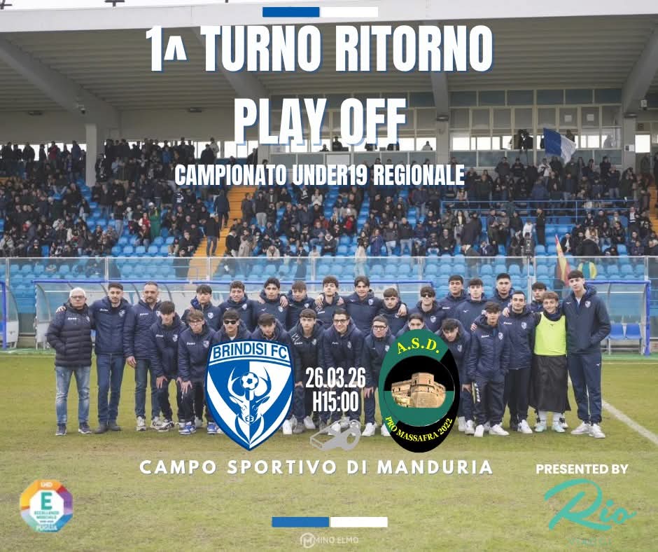 Si giocherà a Manduria, al campo sportivo “Don Bosco”, la partita fra Brindisi e Pro Massafra, ovvero il ritorno del primo turno delle finali regionali del torneo juniores. All’andata la partita era terminata in parità: 0-0. Al Brindisi, guidato in panchina dal tecnico manduriano Giovanni Puglia, dunque, servirà vincere, con qualunque punteggio, per passare il turno.