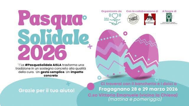 Fragagnano si prepara ad accogliere un importante appuntamento all’insegna della solidarietà. Sabato 28 marzo e domenica 29 marzo, in corso Vittorio Emanuele, dalle 9:30 alle 12 e dalle 17 alle 20, saranno presenti i banchetti solidali della Pasqua promossi da AISLA – Associazione Italiana Sclerosi Laterale Amiotrofica.