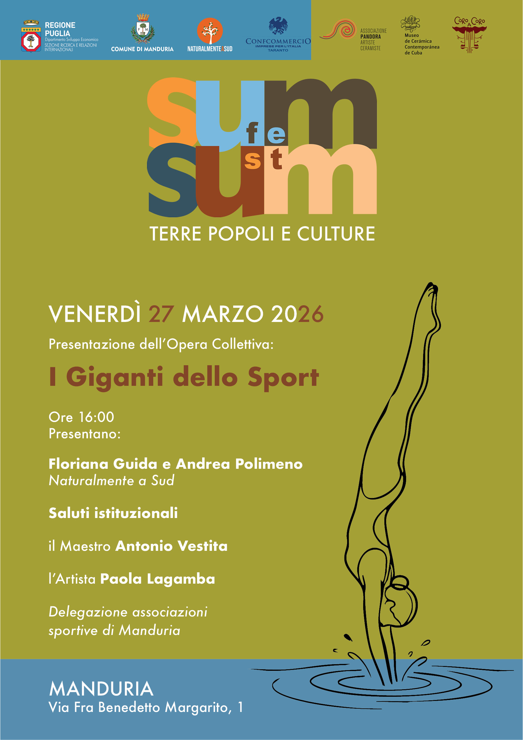 La cerimonia di inaugurazione è presentata da Floriana Guida e Andrea Polimeno (associazione Naturalmente a Sud). Dopo i saluti istituzionali intervengono Tullio Mancino, direttore di ConfCommercio Taranto e figure chiave del panorama artistico e accademico coinvolte nella realizzazione: Antonio Vestita, maestro ceramista; Paola Lagamba, artista e creativa; Isidoro Pennisi (Università Mediterranea di Reggio Calabria).