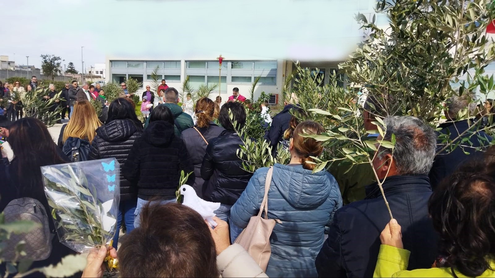 La benedizione dei rami di ulivo da parte del sacerdote generalmente avviene in un luogo fuori della chiesa, dove i fedeli radunati, al momento opportuno, innalzano i ramoscelli per la benedizione: «Si benedicevano prima lontano dalla chiesa, poi facevano la processione come quando hanno fatto a Gerusalemme (…) le palme le hanno benedette in una piazza, sono andati alla chiesa e poi dopo hanno celebrato la messa» (T.E.); «dda nnanti Santu Lunardu (…) e seguìunu la processioni fino alla chiesa [di Santa Maria di Costantinopoli]».