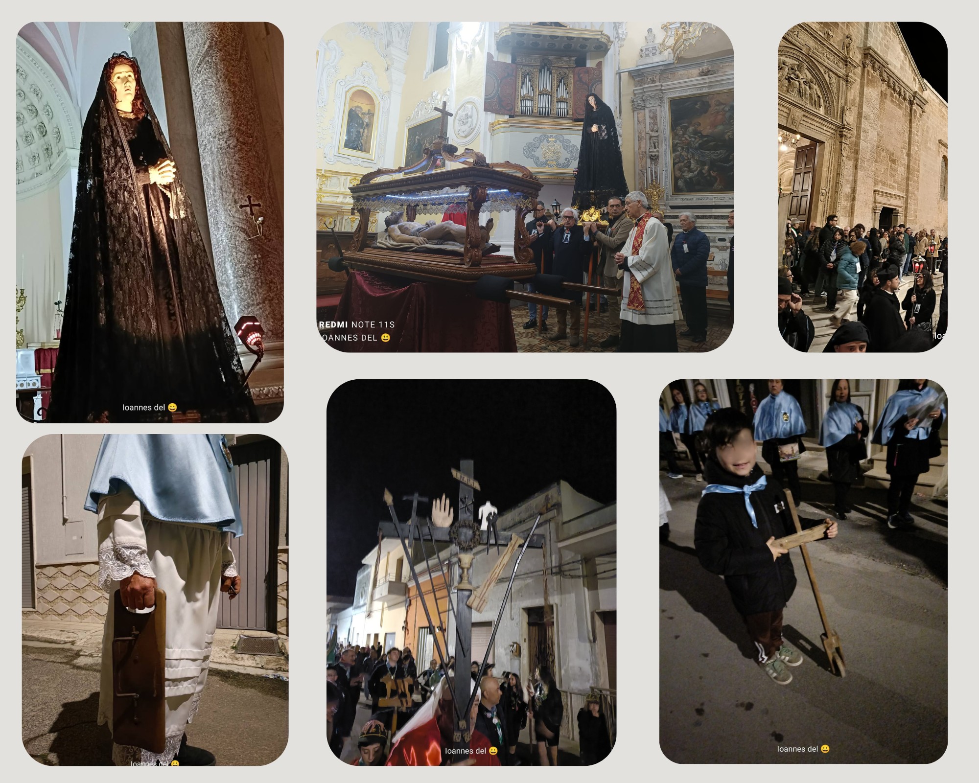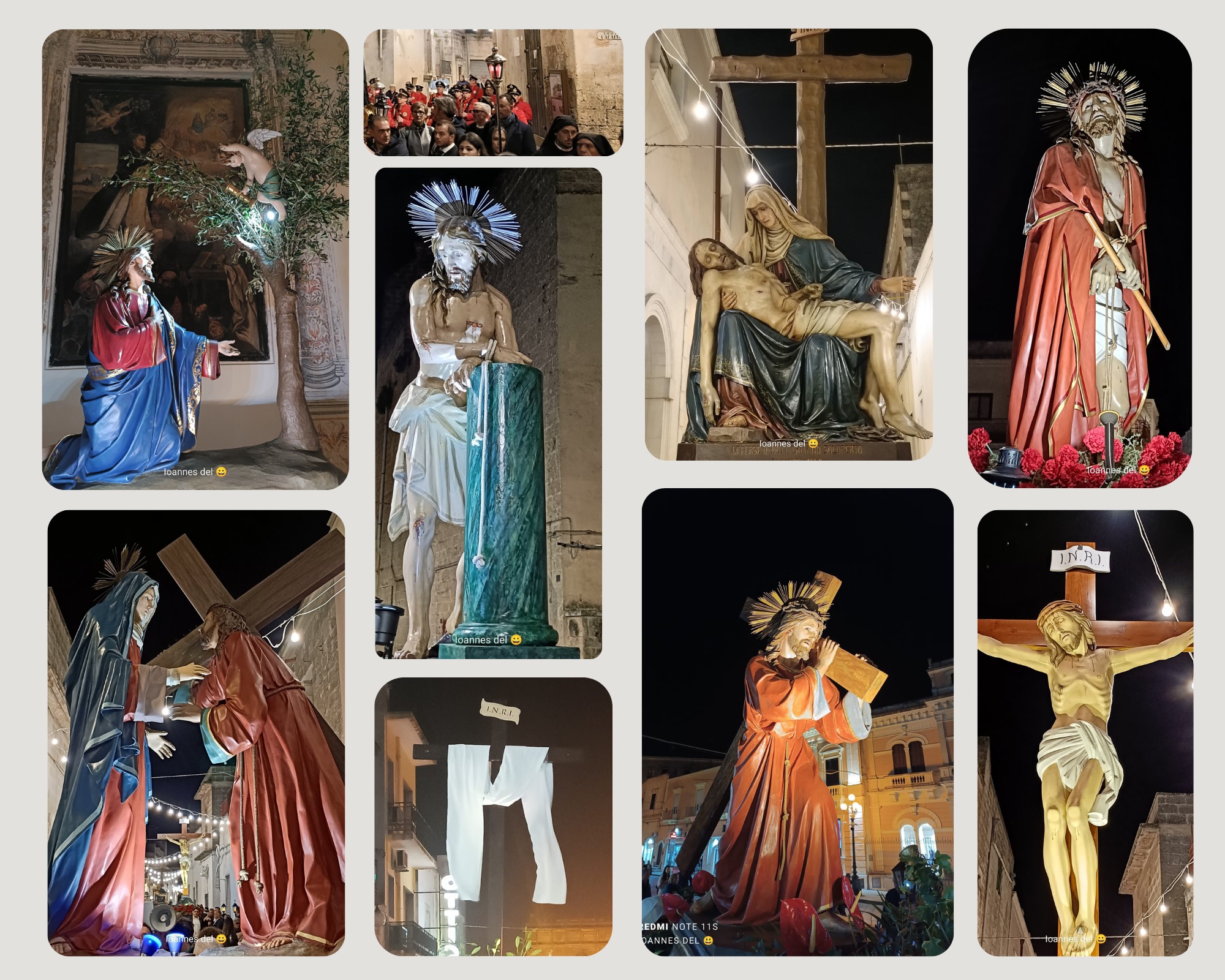 Ogni Confraternita vi partecipa con un Mistero presente nella chiesa dove ha sede, secondo un ordine stabilito: “Cristo all’orto” (Confraternita S. Giuseppe della parrocchia del Rosario); “Cristo alla colonna” (Confraternita del Carmine); “Cristo alla canna” (Confraternita della Purificazione); “Cristo che porta la Croce” (Confraternita San Leonardo della parrocchia S. Maria di Costantinopoli); “Gesù incontra la Madre” (Confraternita dell’Immacolata – Associazione della Passione della parrocchia S. Paolo della Croce); “Gesù crocifisso” (parrocchia San Giovanni Bosco); il Mistero della “Pietà” (parrocchia San Michele Arcangelo); quello della “Sindone”, della parrocchia S. Gemma; segue “lu chiaùtu” (= la bara) con la statua di Cristo Morto, dell’Arciconfraternita del SS. Sacramento della Parrocchia SS. Trinità e, in ultimo, la Statua della Madonna Addolorata della Confraternita della Morte ed Orazione, presente nella chiesa di S. Lucia.