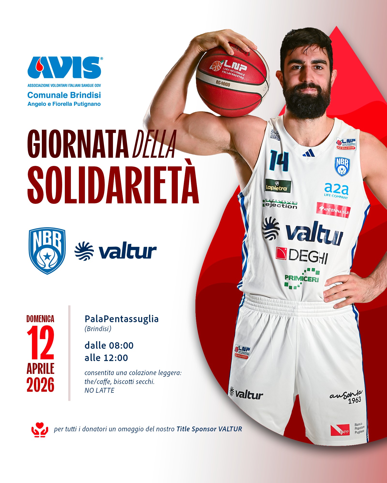 L’Avis Comunale di Brindisi sarà presente al PalaPentassuglia con un’autoemoteca gestita dallo staff medico; tutti coloro che effettueranno una donazione di sangue riceveranno un gadget personalizzato dal title sponsor Valtur.