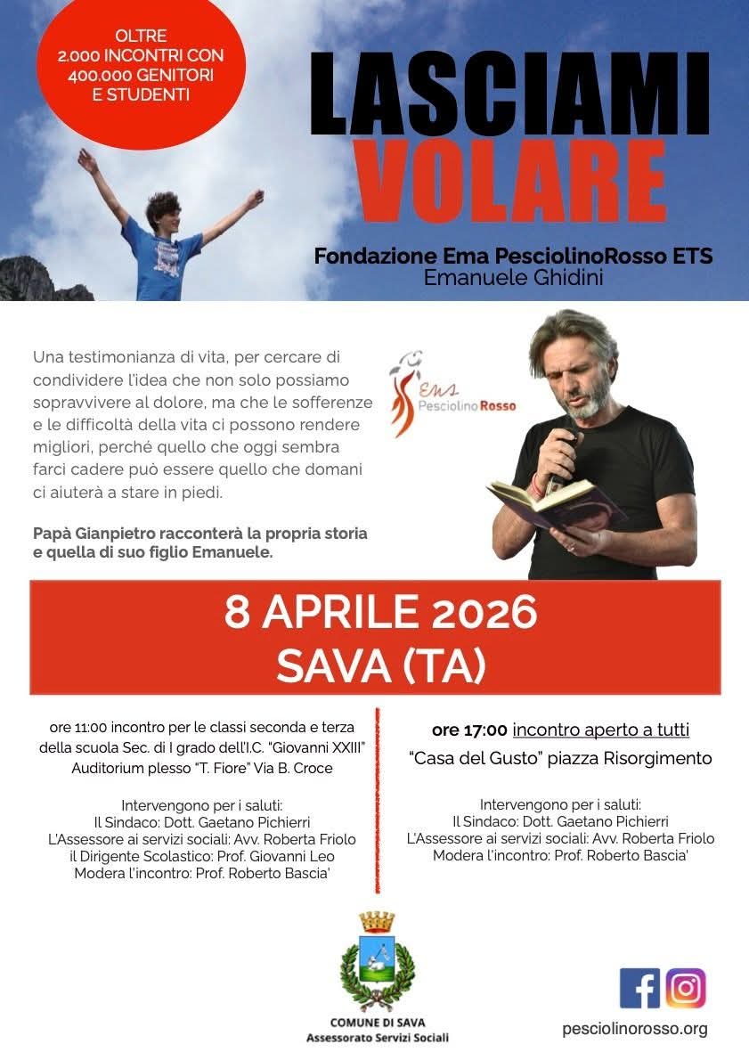 L’Amministrazione comunale di Sava (assessorato ai Servizi Sociali) e la fondazione Ema Pesciolino Rosso, annunciano due incontri speciali dedicati a genitori e studenti, che si terranno a Sava domani (mercoledì 8 aprile). Questi eventi rappresentano un'importante occasione di riflessione e dialogo, volti a sensibilizzare le famiglie sulle difficoltà della crescita e sulle potenzialità dei giovani, promuovendo un approccio positivo alla vita.