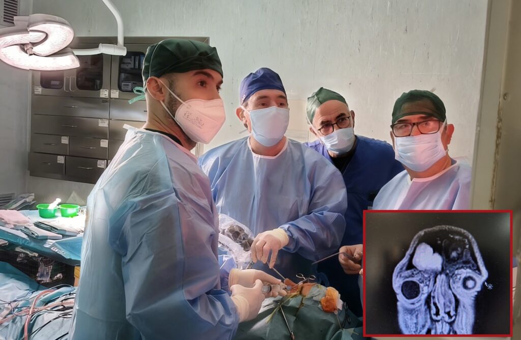L’équipe di Otorinolaringoiatria ha eseguito un intervento combinato mediante tecnica endoscopica, eseguita dai dottori Paolo Berardi e Nicola De Candia, e approccio esterno transcranico con accesso sopraccigliare, eseguito dal dottor Luigi Madami, con il supporto dell’anestesista Michele De Michele e la collaborazione del medico in formazione specialistica Leo Victor Tedone.