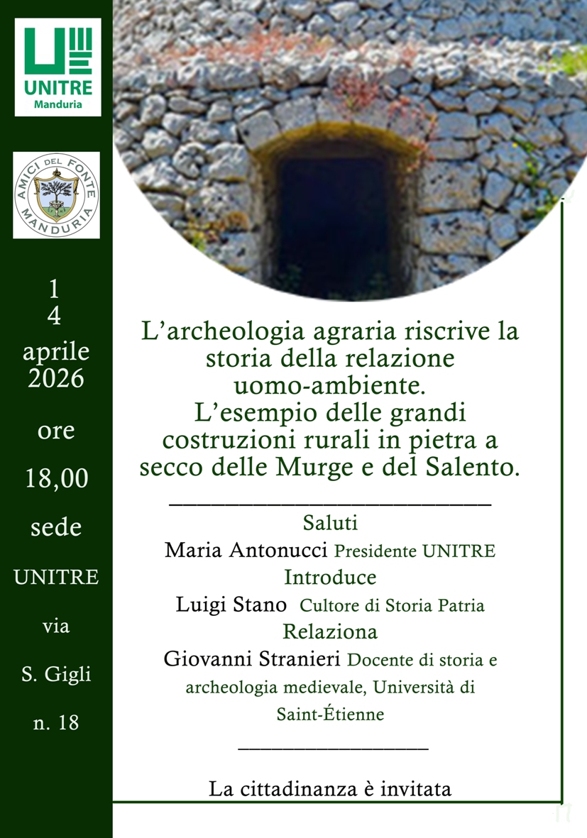 Martedì prossimo, su iniziativa di Unitre e Amici del Fonte di Manduria, è in programma una conferenza sul tema “L’archeologia agraria riscrive la storia della relazione uomo-ambiente. L’esempio delle grandi costruzioni rurali in pietra a secco delle Murge e del Salento”.