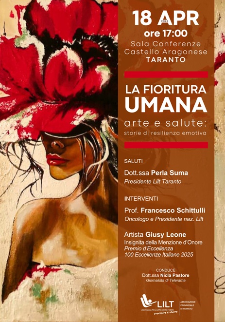 Una riflessione che l’incontro del 18 aprile affiderà principalmente alla testimonianza dell’artista Giusy Leone, pittrice originaria di Manduria, le cui opere sono state esposte sia in Italia sia all’estero, nota anche per aver tratto dalla condizione di malattia una forza generativa rivelatasi terapeutica. La sua produzione artistica, infatti, è profondamente autobiografica, caratterizzata da una notevole intensità emotiva e dalla necessità di trasformare la sofferenza in urgenza creativa. Motivazioni che a dicembre scorso le hanno valso la Menzione d’Onore al Premio “100 Eccellenze Italiane” 2025.