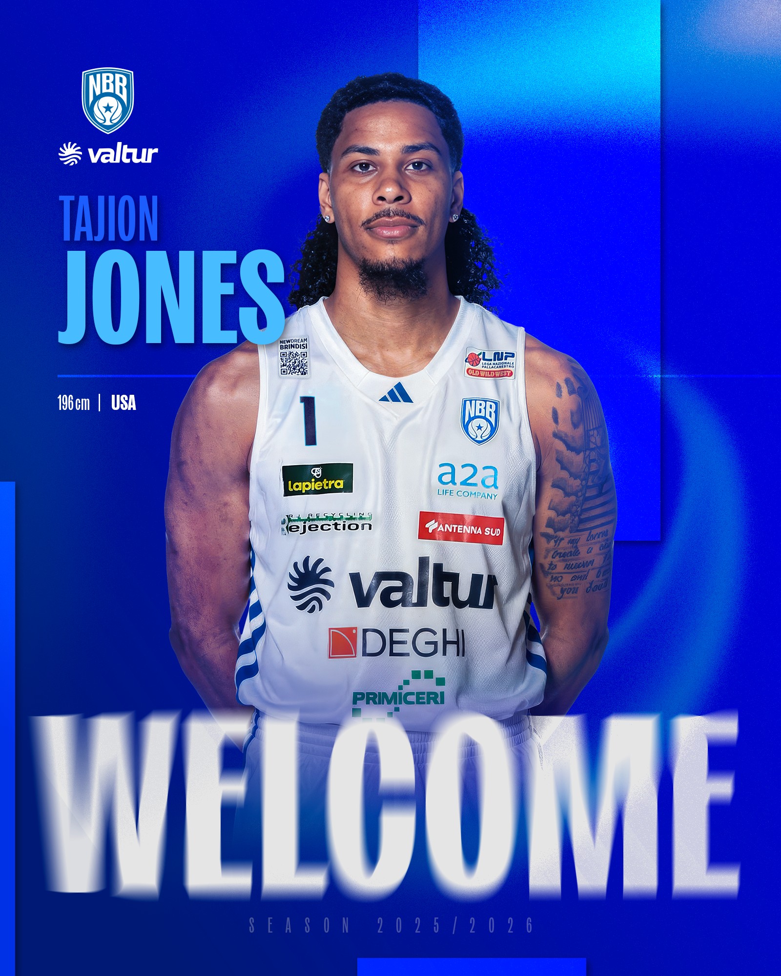 Valtur Brindisi comunica di aver definito l'accordo con l'atleta Tajion Jones, ala americana proveniente da due anni nella massima serie italiana in LBA con la Vanoli Cremona.