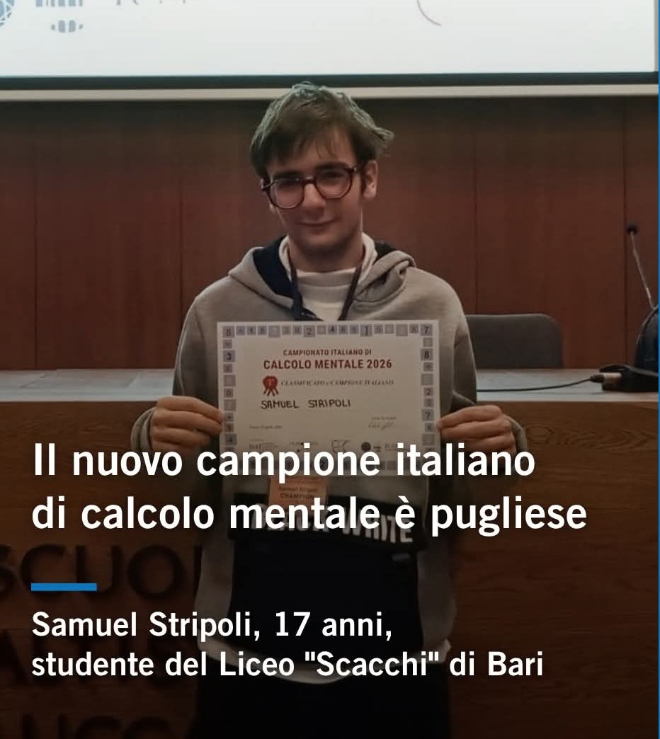 Il 17enne barese Samuel Stripoli, studente del liceo “Arcangelo Scacchi” di Bari, trionfa al Campionato Italiano Assoluto di calcolo mentale, tenutosi a Lucca il 10 e l’11 aprile e organizzato da Studio Giochi Calcolo mentale.