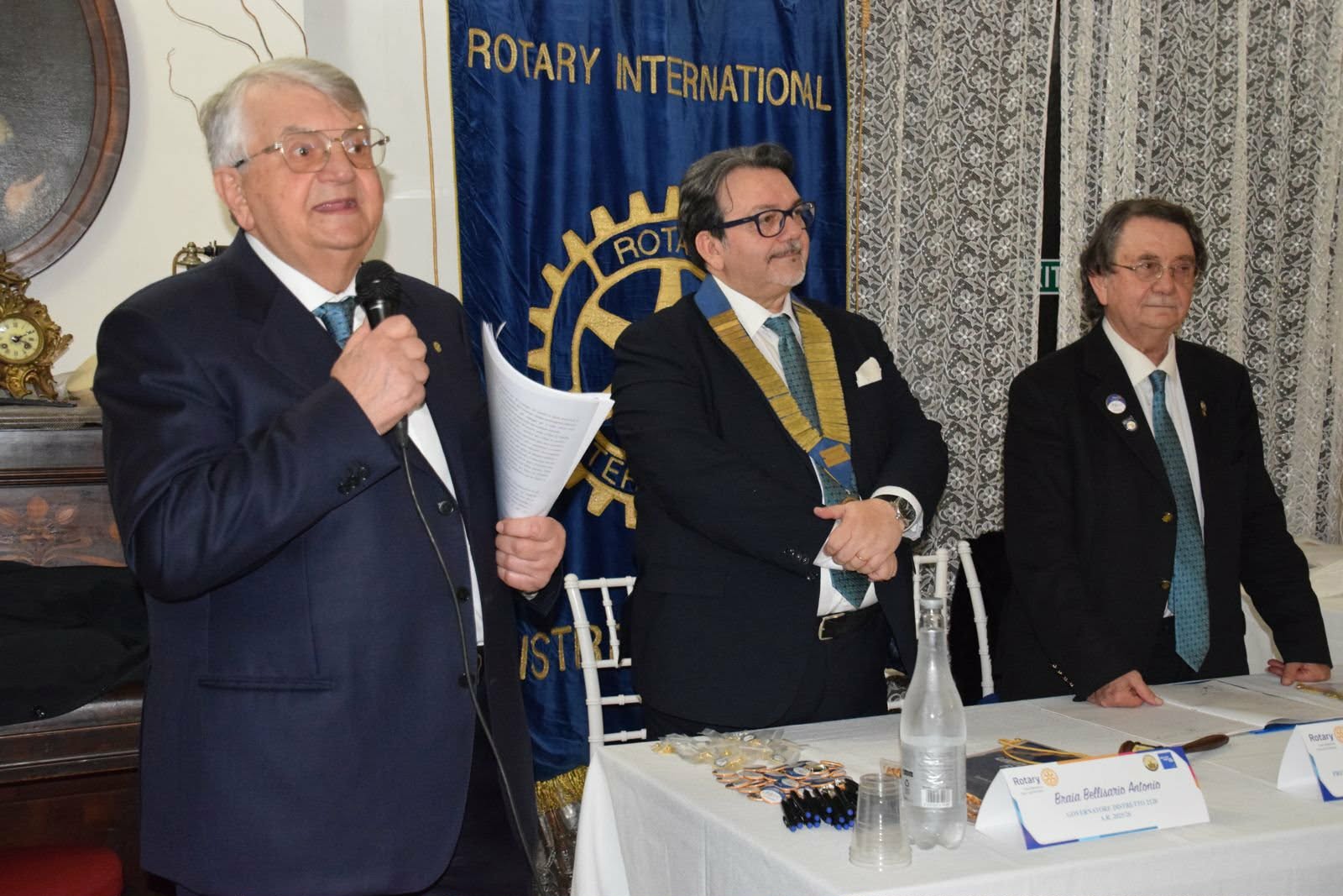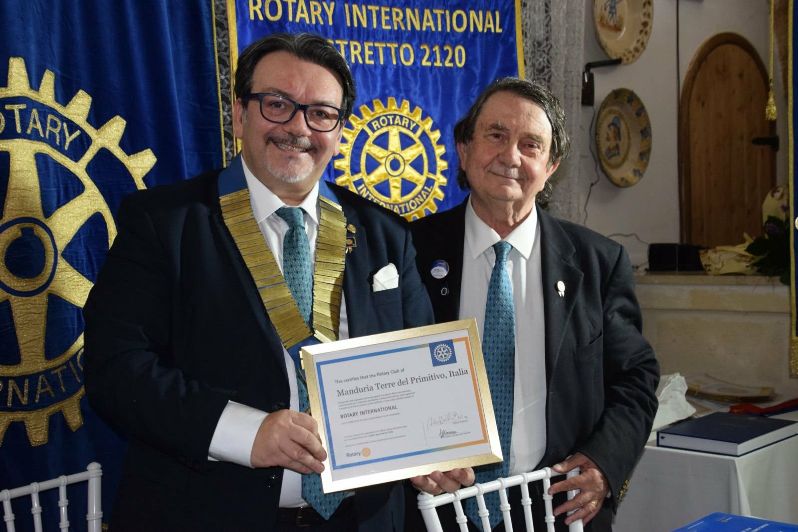 Infine il Labaro (stendardo) del nuovo Club è giunto dalle mani della segretaria Angela Laruccia. Il Governatore Antonio Braia ha consegnato al presidente Giuseppe Perrone la “Charta” di costituzione del Club, proveniente dalla sede internazionale del Rotqary, Evanston, nell’Illinois, firmata dal presidente internazionale Francesco Arezzo: ha messo il Collare Presidenziale sulle spalle del presidente e ha appuntato la Spilletta del Presidente.