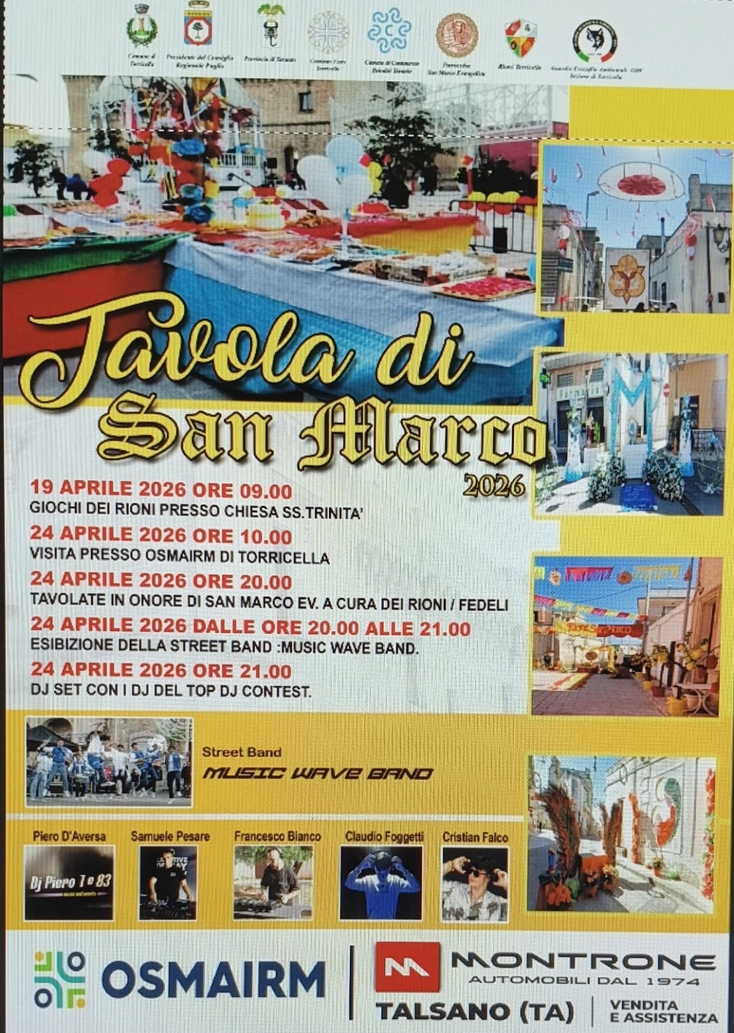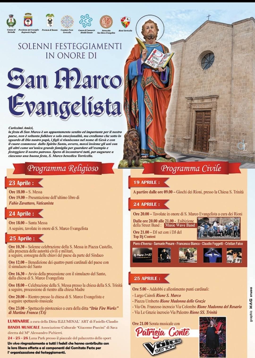 La parrocchia intitolata a San Marco Evangelista di Torricella, guidata dall’amministratore parrocchiale don Danilo Minosa, in stretta collaborazione con il rinnovato Comitato dei Festeggiamenti, hanno allestito un programma religioso e civile in occasione della festa del patrono San Marco Evangelista che si celebra nei giorni 24 e 25 aprile.