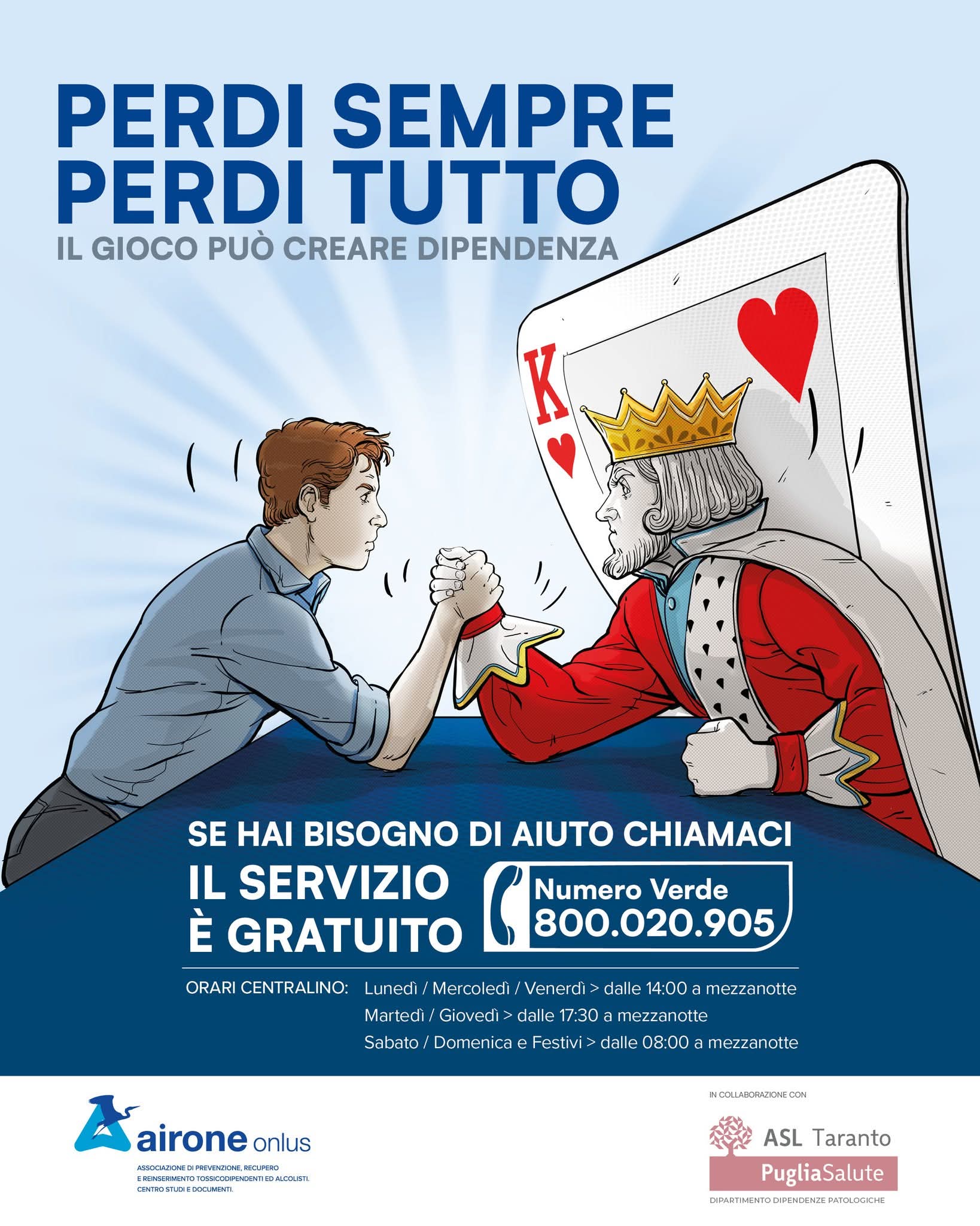 Il numero verde 800020905 fornisce informazioni, supporto e orientamento per il disturbo da gioco d’azzardo patologico. Gestito dalla Comunità Airone, attraverso educatori professionali e operatori qualificati, il servizio telefonico accoglie le richieste di aiuto, rispettando la privacy degli utenti e operando nel massimo rispetto della normativa sulla protezione dei dati sensibili.