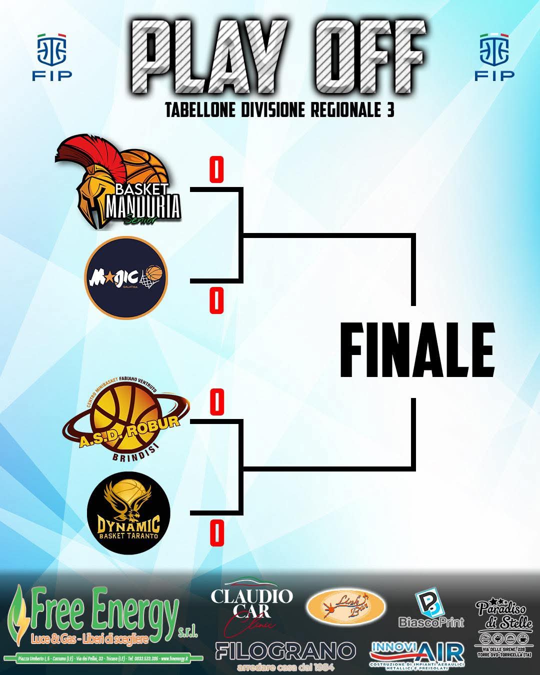 Dopo una regular season dominata, il Basket Manduria sarà impegnato in una delle due semifinali, al meglio delle tre partite, contro il Magic Galatina. Essendosi classificato al primo posto, il Basket Manduria avrà il vantaggio di giocare l’eventuale bella della semifinale (il regolamento vale anche per la finale), in casa.