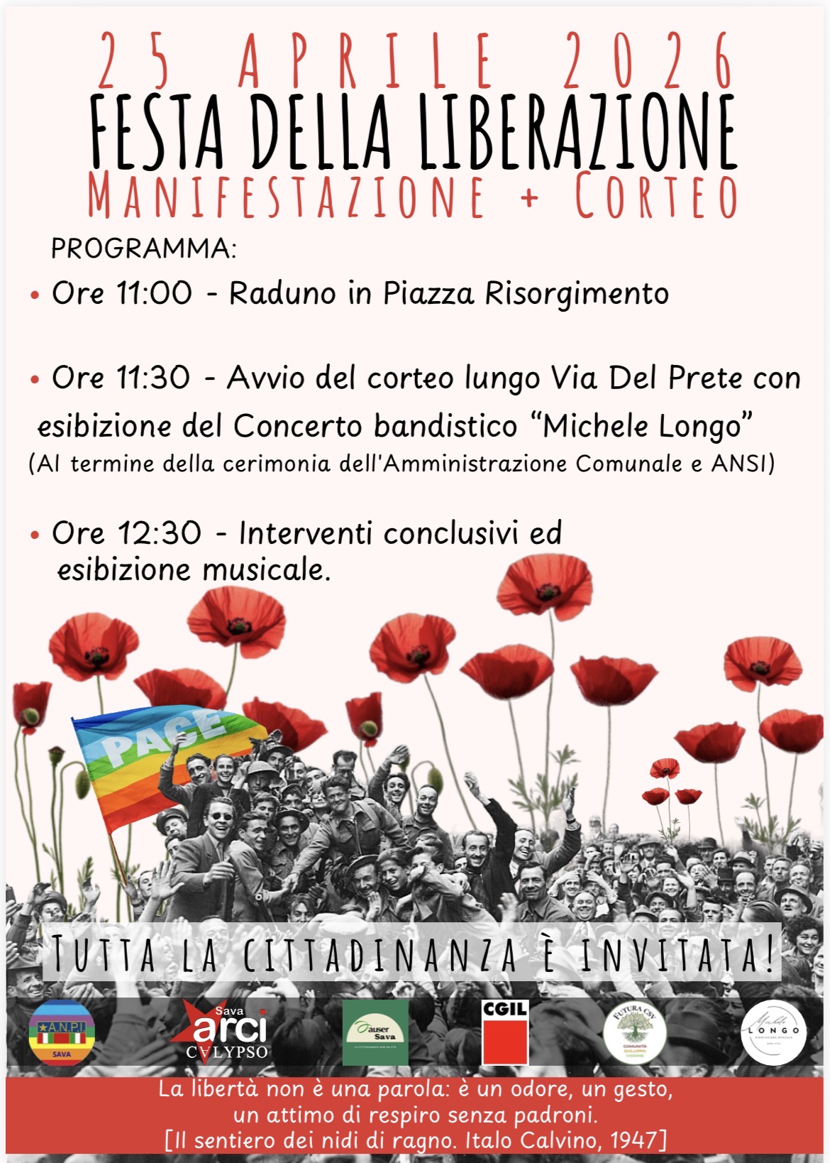Festa della Liberazione 2026, al termine della cerimonia ufficiale, organizzata come ogni anno presso il monumento ai Caduti dall’Amministrazione comunale e dall’ANSI, vi sarà, su iniziativa della sezione ANPI di Avetrana e Sava, il raduno dei partecipanti in piazza Risorgimento da dove partirà un festoso corteo allietato dalle musiche eseguite dal concerto bandistico dell’associazione “Michele Longo”.