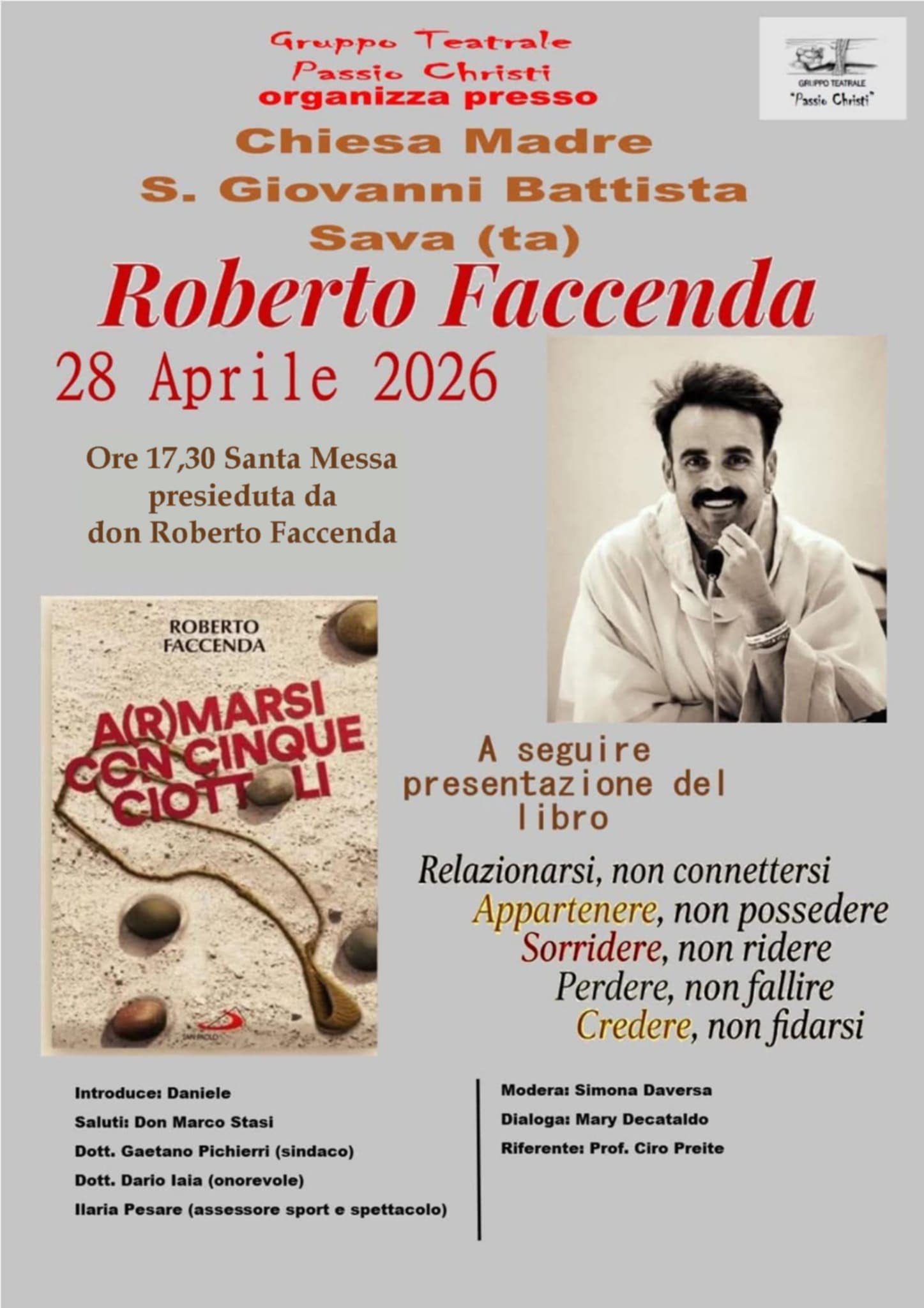 Al termine della celebrazione sarà presentato il libro “A(r)MARSI con cinque ciottoli”, scritto dallo stesso don Roberto Faccemda, un’opera che invita alla riflessione sul valore della fede, del coraggio e del cammino umano e spirituale.