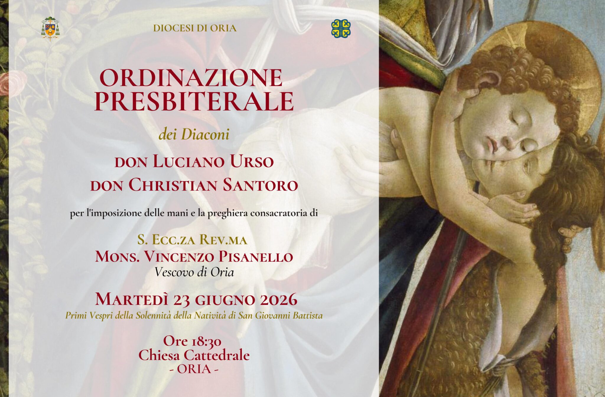 Martedì 23 giugno, alle ore 18:30, nella chiesa cattedrale dell’Assunta di Oria, i diaconi don Luciano Urso e don Christian Santoro saranno ordinati presbiteri per l’imposizione delle mani e la preghiera consacratoria del vescovo Vincenzo, nei Primi Vespri della Solennità della Natività di San Giovanni Battista.