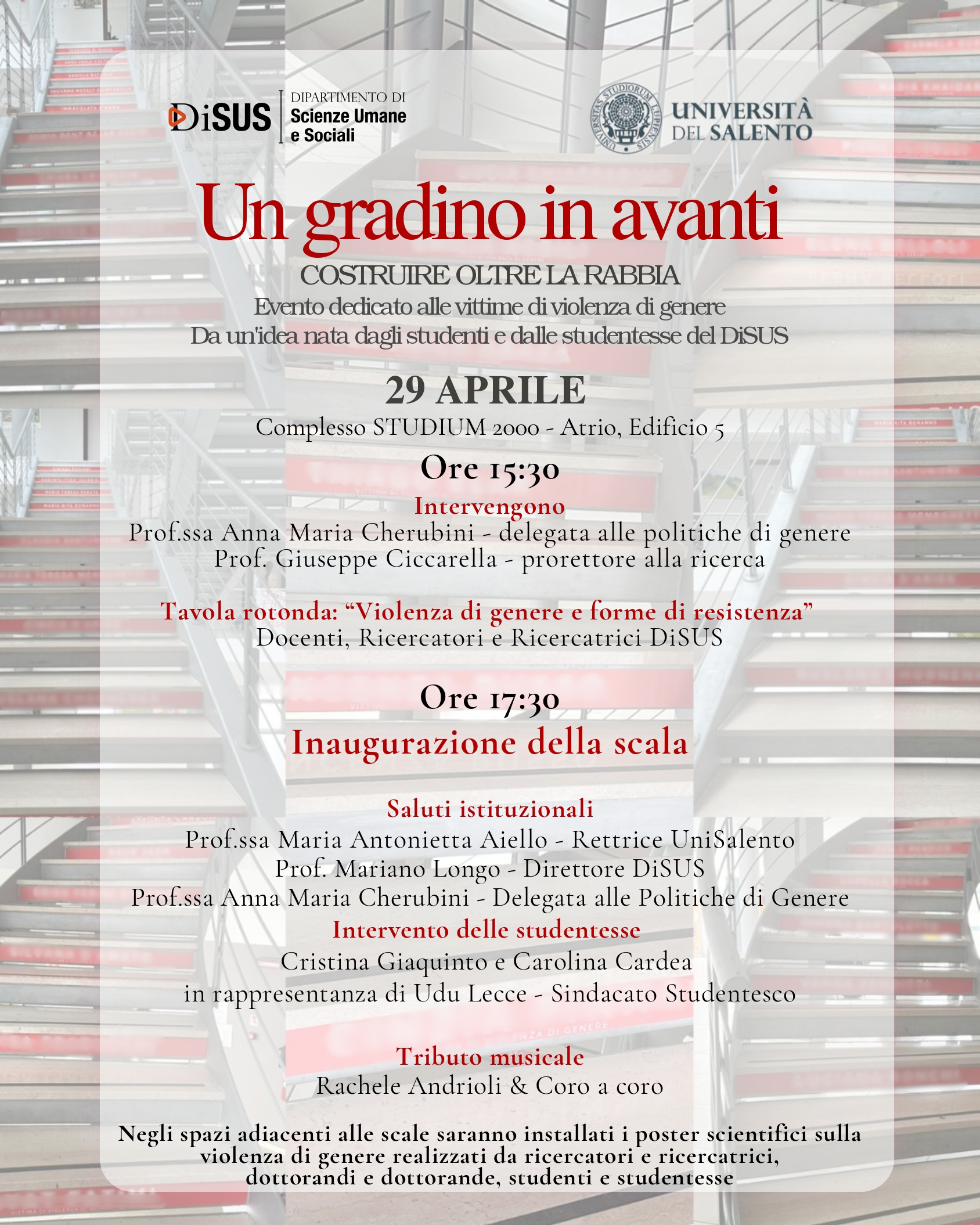 Alle ore 17:30 è prevista l’inaugurazione della scala, simbolo dell’iniziativa, accompagnata dai saluti istituzionali della rettrice Maria Antonietta Aiello, del direttore del Dipartimento, Mariano Longo, del prefetto di Lecce Natalino Manno, della professoressa Cherubini e da rappresentanti delle istituzioni comunali, provinciali e regionali. Seguirà un intervento delle studentesse Cristina Giaquinto e Carolina Cardea, in rappresentanza di Udu Lecce – Sindacato Studentesco. Infine, è previsto un tributo musicale a cura di Rachele Andrioli & Coro a coro.