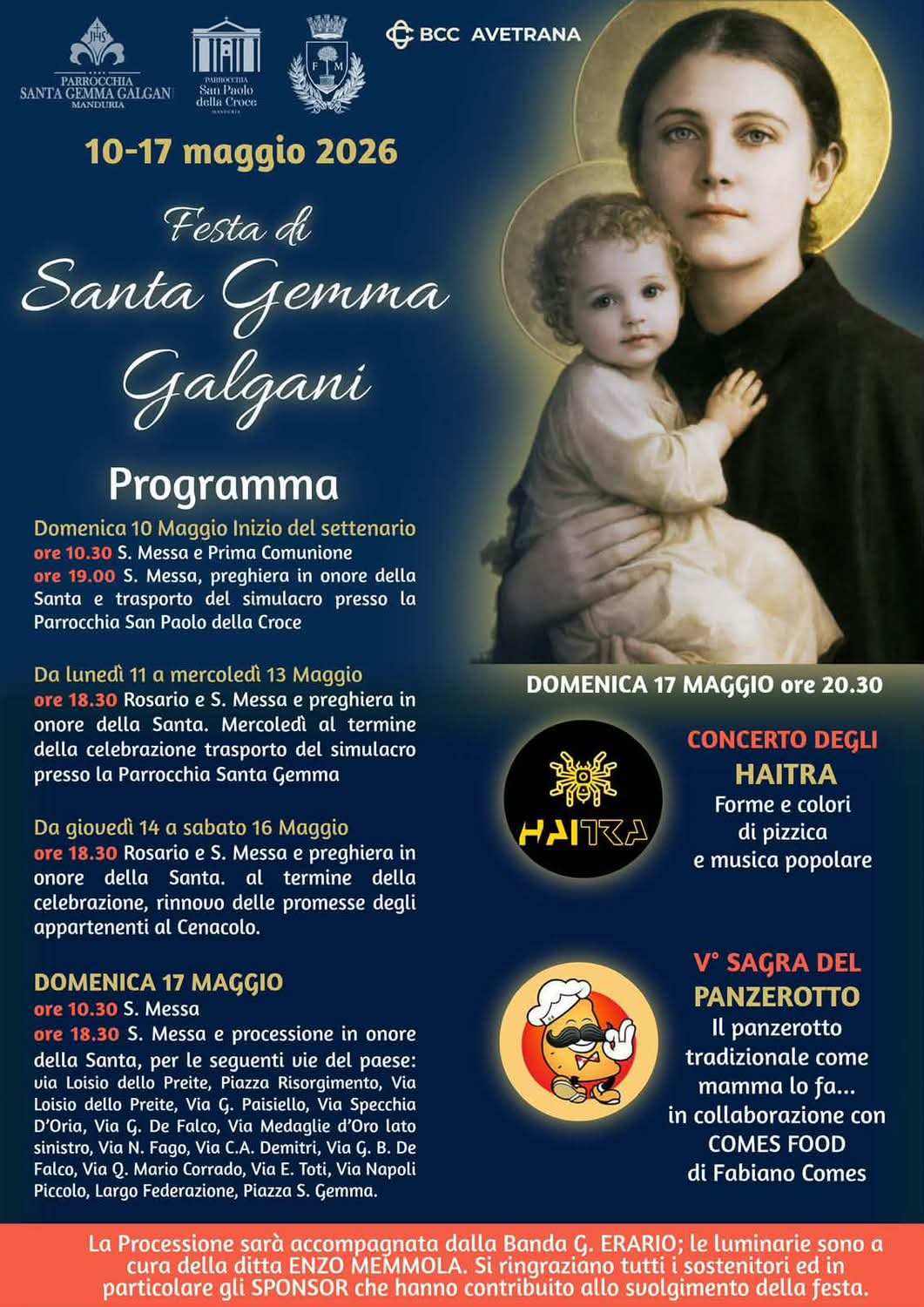 Ore 18,30: Rosario, S. Messa e preghiera in onore della sante. Mercoledì, al termine della celebrazione, trasporto del simulacro presso la parrocchia Santa Gemma