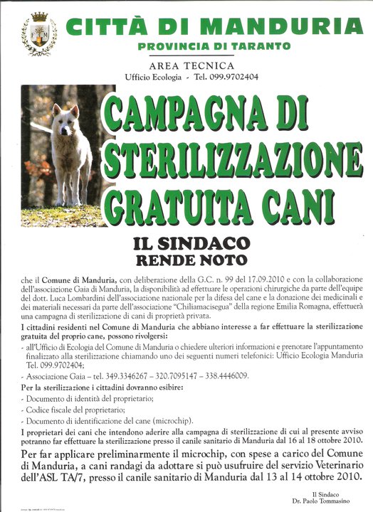 Da qualche giorno la città è tappezzata di volantini che riepilogano, dettagliatamente, le finalità e il programma dell’iniziativa, già deliberata dalla giunta comunale. A Manduria, per tre giorni interi (dal 16 al 18 ottobre), sarà presente l’equipe del dott. Luca Lombardini, dell’Associazione Nazionale per la Difesa del Cane, che eseguirà gratuitamente gli interventi di sterilizzazione dei cani di proprietà privata. I medicinali e i materiali necessari per gli interventi di sterilizzazione saranno messi a disposizione, invece, dall’associazione “Chi li ama ci segua” della Regione Emilia Romagna. Trade d’unione fra le associazioni e il Comune di Manduria sono i volontari dell’associazione Gaia, da anni impegnati in una meritoria opera di difesa e di tutela dei cani.