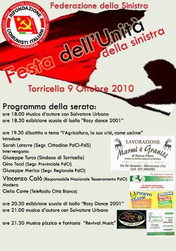 Comunisti Italiani di TorricellaSabato 9 ottobre i comunisti italiani della Federazione della Sinistra hanno deciso di organizzare la festa dell’ unità della sinistra in piazza “Mimmo Lacaita”. (piazza Castello).