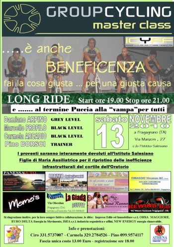 fitness e di solidarietà.Dopo il successo dello scorso anno il GROUP CYCLING master class, in collaborazione con l’associazione “Gruppo Famiglia Speranze Nuove” e su espressa volontà del suo presidente Ciro Epifani, a Fragagnano, sabato 13 novembre, presso