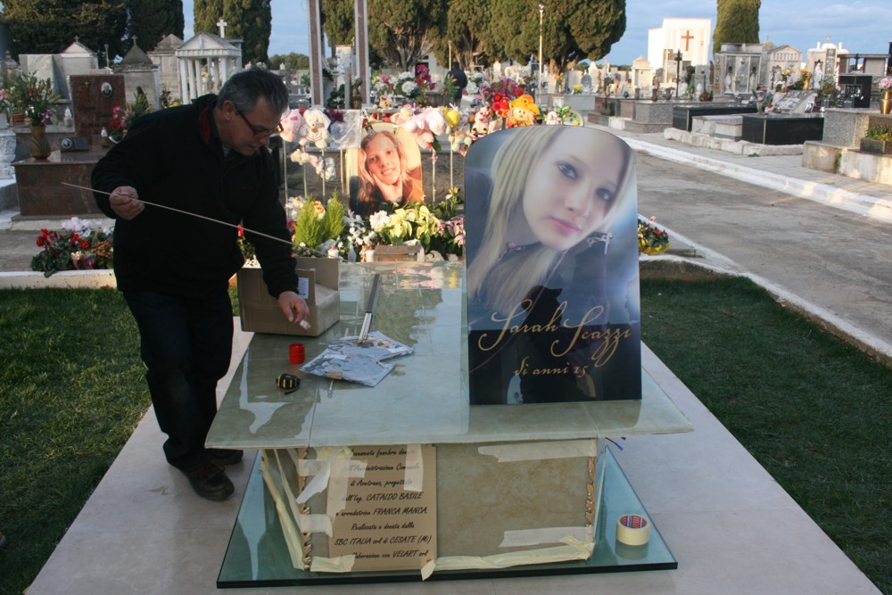 di Sarah, una giovanissima vita spezzata per futili motivi. E, nello stesso tempo, per essere da monito alle future generazioni: mai più un dramma di tale portata, che ha scosso le coscienze di una intera nazione.Con questo spirito, da ieri mattina, Maurizio Aquilanti, uno dei soci dell’azienda SBC di Cesate, nel milanese, e i suoi operai sono al lavoro per montare il monumento che abbellirà la spoglia tomba in cui riposa Sarah Scazzi, a pochi metri dall’entrata principale del cimitero avetranese. Lavori che dovrebbero concludersi, presumibilmente, entro stamani.