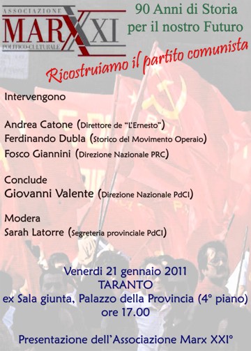 Partito Comunista Italiano, venerdì 21 gennaio, alle ore 17, presso l’ex sala giunta del palazzo della Provincia, si terrà la presentazione dell’associazione politico-culturale Marx XXI° , che mira a dare un contributo per la riunificazione di tutti i comunisti sotto un unico partito.