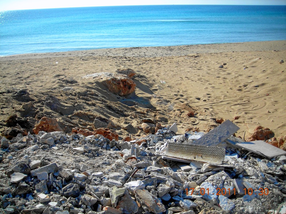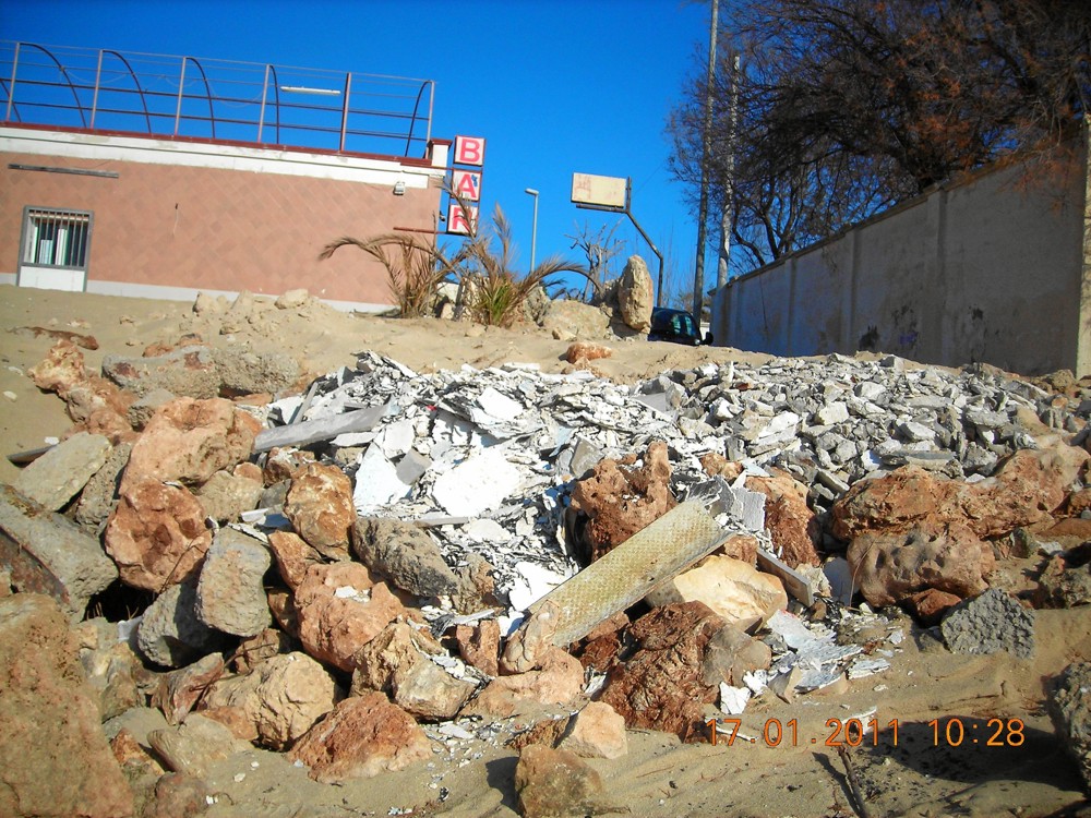 battigia, prospiciente una pizzeria, dove nel mese di marzo 2010, in seguito ad un mio esposto, la Guardia di Finanzia Nucleo Mobile di Manduria sottopose a sequestro un consistente tratto di spiaggia in cui ignoti avevano insabbiato circa di 10 tonnellate di “sfridi bituminosi” rinvenienti da manto stradale, successivamente trasportato in mare dalle mareggiate, ora è stato dato avvio a scarichi abusivi di pezzi di eternit (amianto) e materiali inerti da costruzioni.