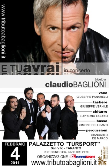 Taranto, appuntamento con “E TU…Avrai”, tributo a Claudio Baglioni, raffinato concerto della band “Tributo al Claudio Nazionale”.Completamente rivisitati i migliori brani del cantautore Romano, che ha portato alla luce successi come “QUESTO PICCOLO GRANDE AMORE”, “NOI NO”, “AVRAI” e “SABATO POMERIGGIO”.