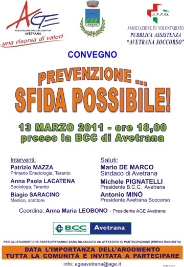 “Avetrana Soccorso”: un convegno sul tema “Prevenzione, una sfida possibile”.«Abbiamo fortemente voluto questa iniziativa per suscitare nel pubblico lo sdegno per un dato di fatto: la gente si ammala di patologie tumorali tra il 20 e il 40 per cento in più rispetto alle altre città» si legge in una nota dell’A.Ge. «Nei nostri comuni assistiamo inermi e con accettazione qualcosa che forse si potrebbe fermare o migliorare. Tanti i giovanissimi che si ammalano. Vogliamo capire ed essere aiutati a capire.