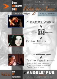 Domenica 20 marzo, a partire dalle ore 22 e con ingresso libero, all’Angelè Pub, alcuni amici di Anna si esibiranno, con il piacere di farlo, in un concerto “live unplugged” davvero unico: Alessandro Coppola e Celine Ottrià (dai NIDI d’ARAC) assieme agli amici delle PIETREVIVE del SALENTO, guidati dal maestro Tonino Papadia. Siete tutti invitati...