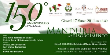 Tommasino e dell’Assessore alla Cultura,dott.ssa Lucia Stefanì, moderatore Fulvio Filo Schiavoni, presidente della Cantina, con la partecipazione del Coro Alma & Soul Ensemble diretto dal Maestro S. Moscogiuri.In coerenza con gli obiettivi ed il tema delle Celebrazioni nazionali, la conferenza ha ottenuto il riconoscimento da parte dell’Unità Tecnica di Missione della Presidenza del consiglio dei Ministri, con la conseguente autorizzazione all’uso del logo ufficiale delle celebrazioni per il 150° Anniversario dell’Unità d’Italia.