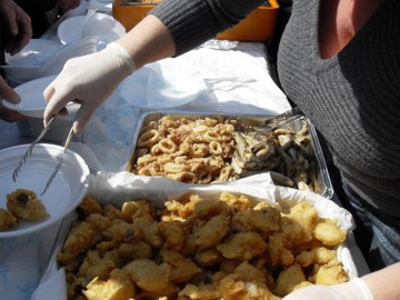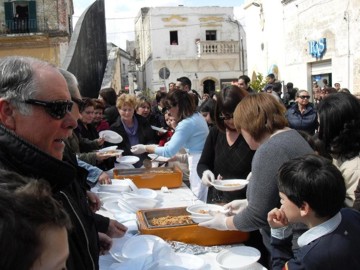 Manzo di Lecce che la realizzò nel 1944, ha luogo la processione che scorta l’immagine del santo attraverso le vie del centro storico. La statua ha subìto un primo restauro nel 1988 ad opera del maestro cartapestaio cav. Pietro Indino di Lecce e successivamente un altro, operato nel 2006 dall’artista leccese S. Merico. Essa fu realizzata in sostituzione di una preesistente, andata distrutta da un violento temporale nel corso di una delle processioni celebrative. Il corteo è di solito presieduto dalle autorità politiche e religiose locali e vi partecipa anche la Congrega dell’Immacolata. A mezzogiorno c’è la benedizione della Tria, presente sulle tavole imbandite in Piazza Vittorio Veneto che, subito dopo, viene distribuita ai presenti per la degustazione. Il piatto, elaborato secondo varie ricette, è costituito essenzialmente da una tagliatella fatta in casa condita con sugo di pesce, frittura mista e pastelle, sempre a base di pesce. Le varie portate vengono elaborate dai più rinomati ristoranti della zona oltre che da varie associazioni locali. Grazie a tutto ciò, coloro che partecipano all’evento riscoprono il piacere di incontrarsi, chiacchierare e sentirsi in quell’occasione una grande famiglia.Tasto e immagini di Antonietta Trono
